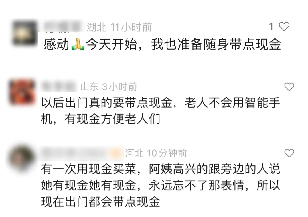 有网友注意到了视频中男子的细节动作,点赞道,“大哥伸手扶老人那一把,真的让我感动到哭。”还有网友表示,“以后出门真的要带点现金,老人不会用智能手机,有现金方便老人们。”