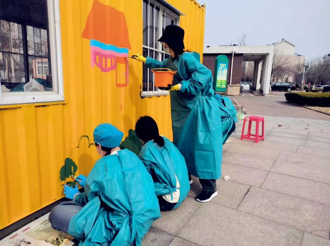 小屋是由闲置的核酸小屋提升改造而成,整体风格设计和外部手绘是由东营职业学院大学生志愿者完成。他们利用周末时间,用画笔勾勒出一幅幅美丽的图画,精心绘制的图案丰富了社区的色彩,也为小区增添了和谐、人文的气氛。