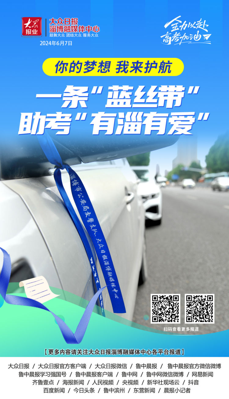 6月7日,2024高考首日,淄博各考点外,一条条蓝丝带系在出租车、私家车后视镜上,许多家长考生手腕上也系上蓝丝带。热心司机、广大市民出行主动礼让考生,为学子们参加高考营造良好的环境。一条条“蓝丝带”全城飘荡,助考“有淄有爱”。