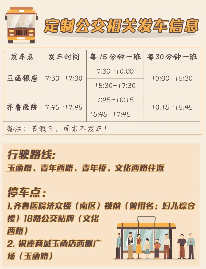 为强化山东大学齐鲁医院周边交通综合治理,着力缓解群众就诊“停车难”“行车难”问题,近日,山东大学齐鲁医院、济南市城乡交通运输局、济南市公安局交警支队、济南公交集团等单位联合实施便民新举措,在齐鲁医院至银座商城玉函店区间开设定制公交,就医人员及家属均可免费乘车。