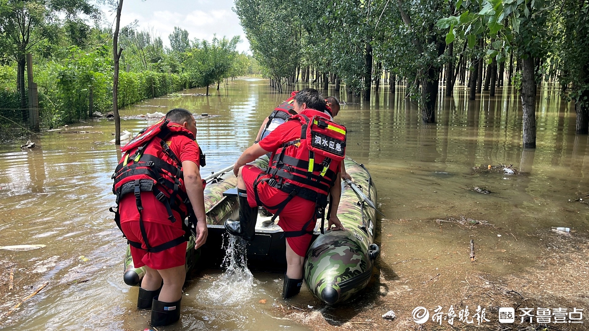 了解到相关情况后。现场救援队员立即将冲锋舟抬到水中,三名队员带着救生马甲和绳索,前往老人家中转移被困人员。