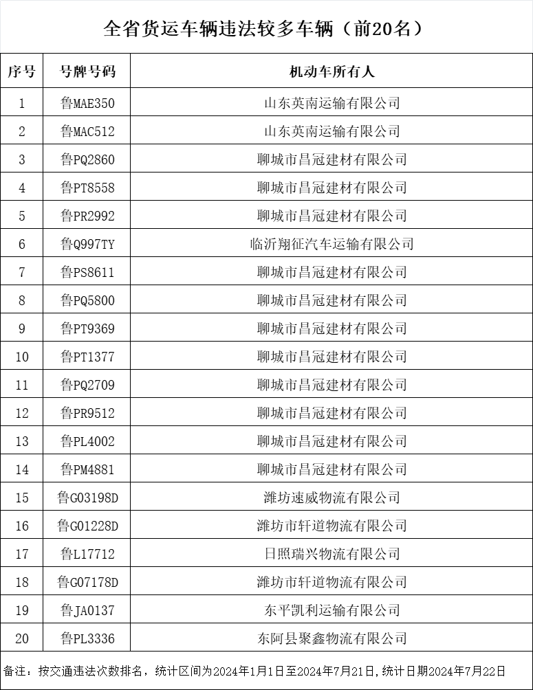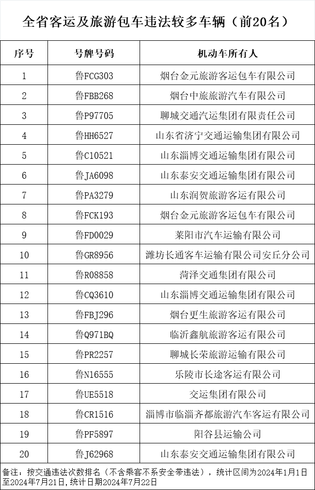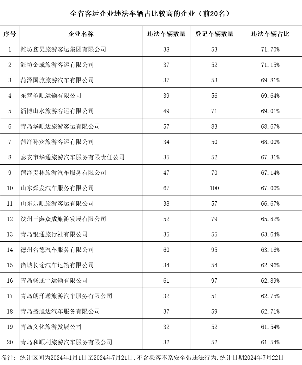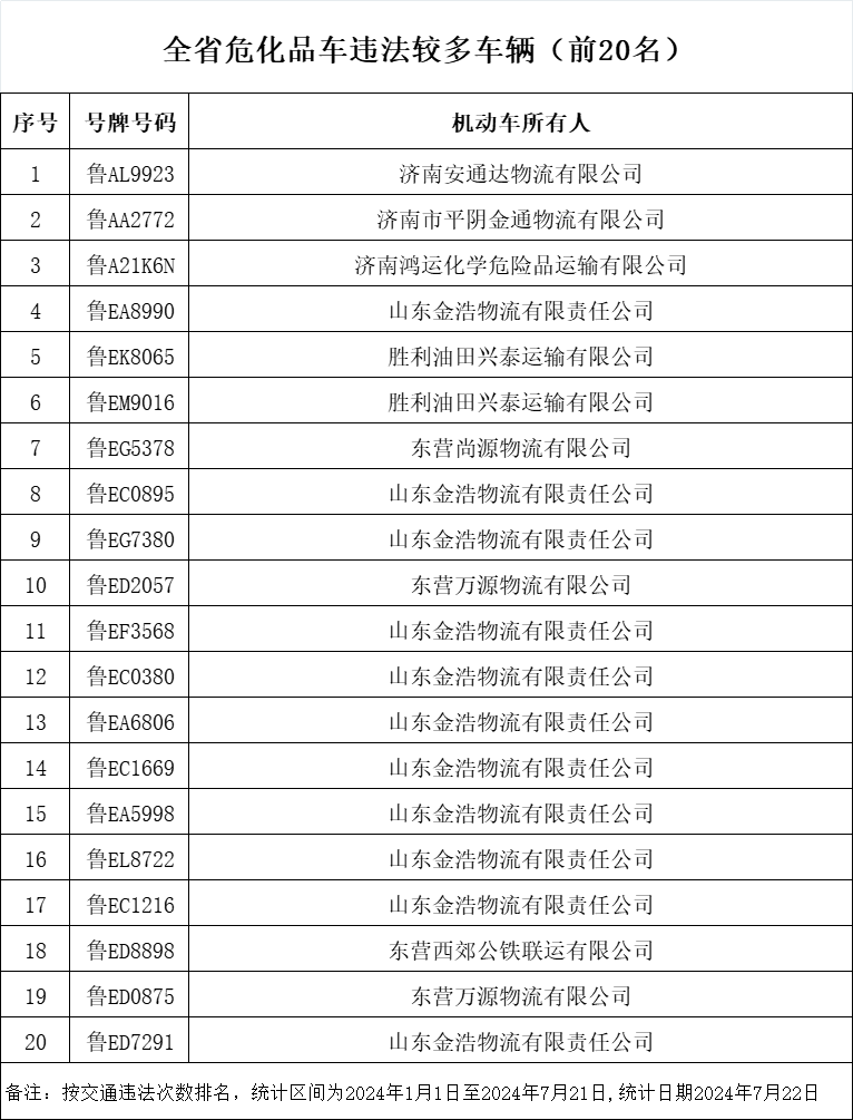 近日,山东省公安厅交通管理局发布7月份重点交通违法企业、车辆及驾驶人名单。此次曝光的交通违法次数较多的“两客一危一货”车辆共计60辆,违法车辆占比较高的“两客一危一货”运输企业共计60家,违法较多的农村面包车驾驶人20人,终生禁驾人员36人,同时发布了一批典型案例和事故多发路段。