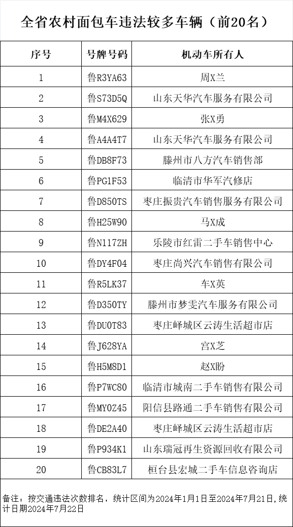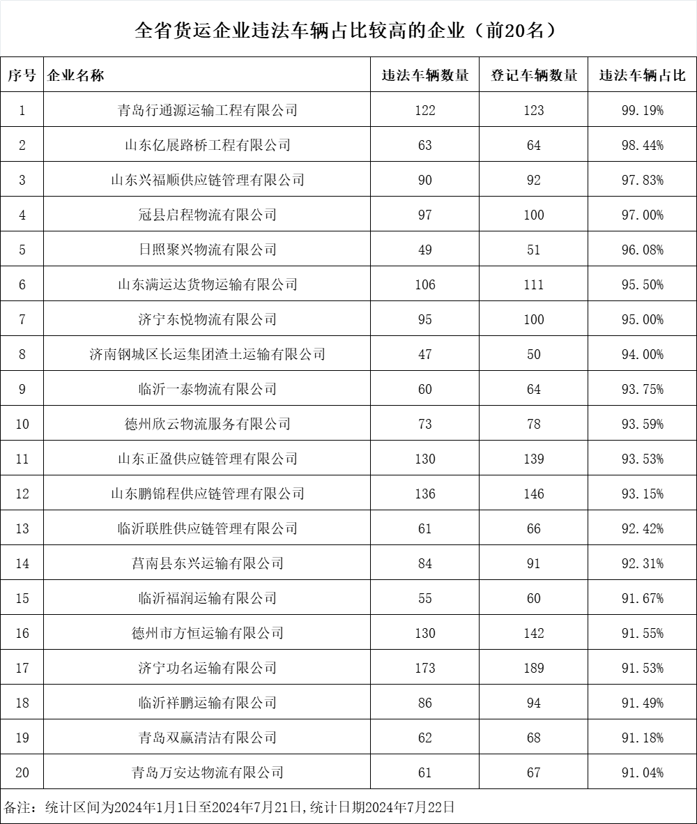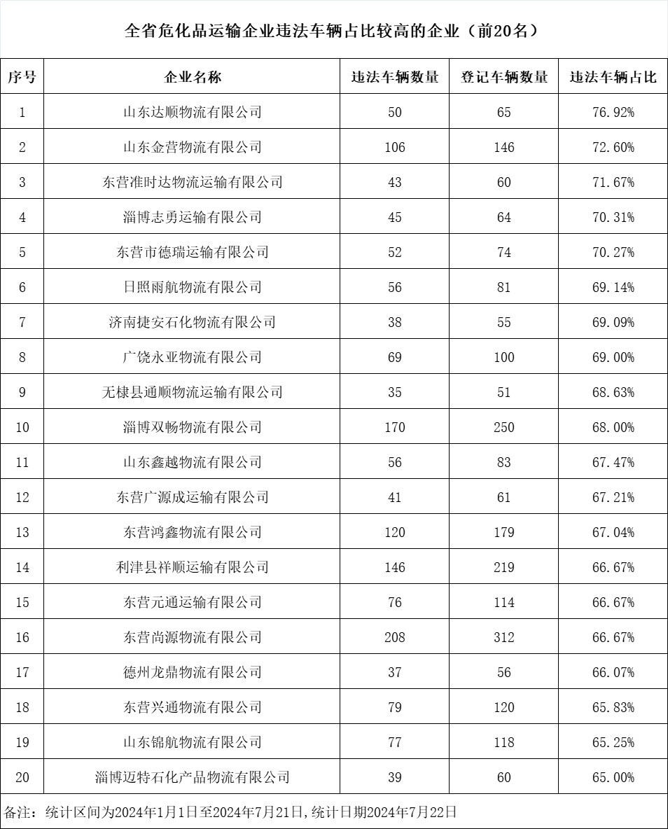 近日,山东省公安厅交通管理局发布7月份重点交通违法企业、车辆及驾驶人名单。此次曝光的交通违法次数较多的“两客一危一货”车辆共计60辆,违法车辆占比较高的“两客一危一货”运输企业共计60家,违法较多的农村面包车驾驶人20人,终生禁驾人员36人,同时发布了一批典型案例和事故多发路段。