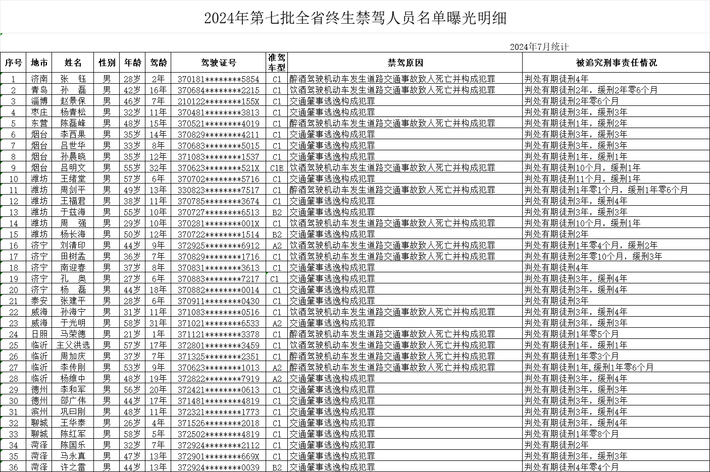 山东省第七批终生禁驾人员名单曝光