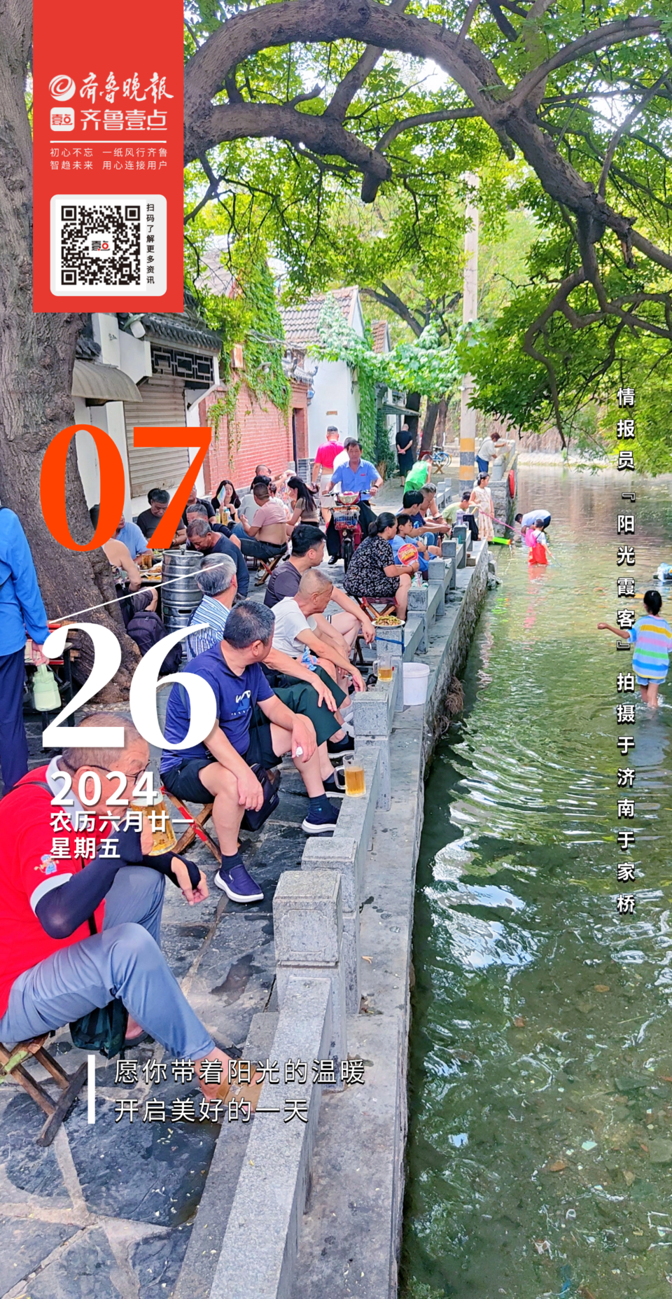 盛夏七月,济南于家桥已是一片翠绿,清冽的泉水缓缓流淌,水草随水流轻轻摇摆,市民在河边喝扎啤、戏泉水,静享夏日好时光。