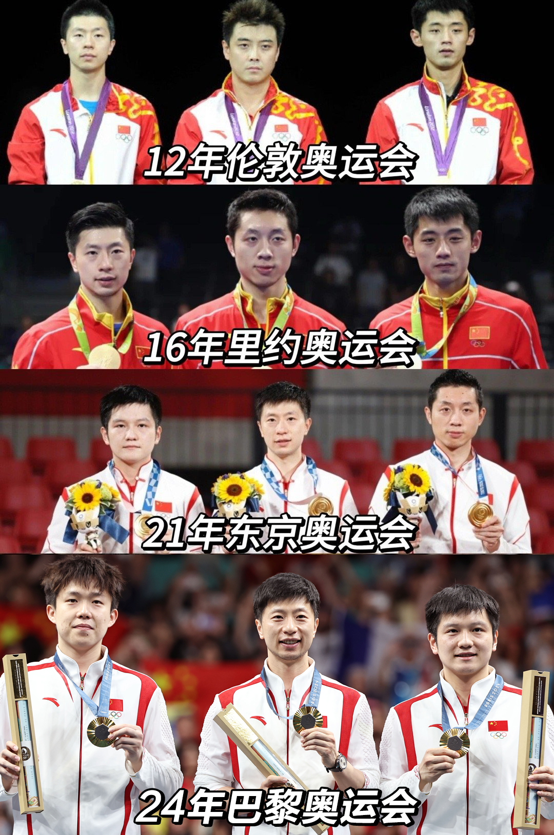 马龙参加了四届奥运会的男子团体比赛,2012年伦敦奥运会后送走了队友王皓;2016年里约奥运会后送走了队友张继科;2021年东京奥运会后送走了队友许昕;2024年巴黎奥运会后马龙也要离开了。