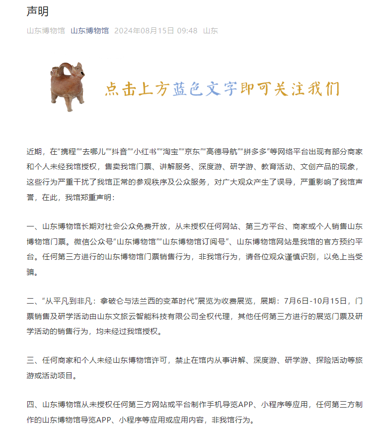 8月15日,山东博物馆发布声明称,近期,在“携程”“去哪儿”“抖音”“小红书”“淘宝”“京东”“高德导航”“拼多多”等网络平台出现有部分商家和个人未经山东博物馆授权,售卖山东博物馆门票、讲解服务、深度游、研学游、教育活动、文创产品的现象,这些行为严重干扰了山东博物馆正常的参观秩序及公众服务,对广大观众产生了误导,严重影响了山东博物馆声誉。