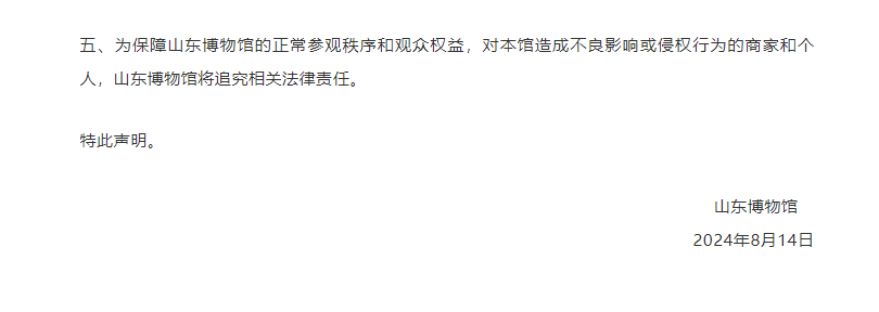 为保障山东博物馆的正常参观秩序和观众权益,对本馆造成不良影响或侵权行为的商家和个人,山东博物馆将追究相关法律责任。