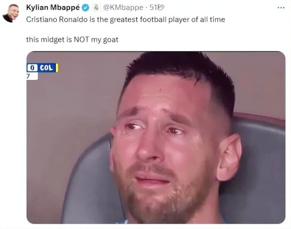 8月29日,法国球星姆巴佩在社媒发布多条动态,其中一条动态晒出了梅西哭泣的照片并配文:“Cristiano Ronaldo is the greatest football player of all time,this midget is NOT my goat(C罗是史上最佳球员,图中这个侏儒不是goat)”,瞬间冲上了社媒热搜。许多网友都猜测:姆巴佩被盗号了?