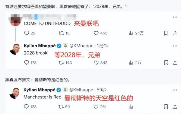 此外,姆巴佩还向球迷许诺自己在2028年会加盟曼联,并说“曼彻斯特是红色的”,完全超乎球迷的想象。