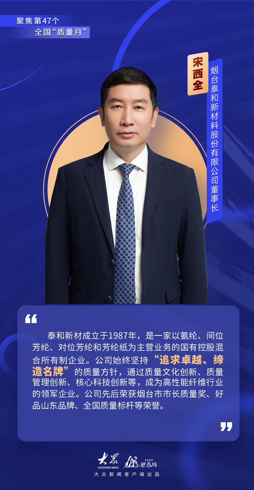 9月3日上午,在山东省2024年“质量月”活动启动仪式暨首席质量官典型经验报告会上,烟台泰和新材料股份有限公司董事长宋西全介绍,泰和新材将“客户至上、追求卓越”的质量文化作为企业文化的核心。高标准落实首席质量官制度,山东省推行首席质量官制度以来,我们深刻认识到建设一支“质量高管”队伍是“质量致胜”的最好保障,作为企业第一质量人,我把质量发展放在经营决策的第一位,率先参加山东省首席质量官典型遴选,用行动向全体员工传递质量第一的理念。并以此为契机,在9个事业部、子公司推行“一把手”担任首席质量官制度,将质量工作放在企业最重要的地位来抓。树立企业“大质量”观,在公司经营管理中,不仅仅关注产品质量、还将经营质量、产业链质量、供应链质量全部纳入各事业部KPI考核内容,坚定的带领企业走一条“质量致胜”的发展道路。强化质量人才建设,公司重点致力于高层次质量队伍的塑造,建设了一支拥有国家院士、海外学者及行业专家等高层次人才12人,研究生学历300余人的高质量人才队伍,这些人才为企业注入了追求卓越、追求品质、追求创新的浓厚氛围。