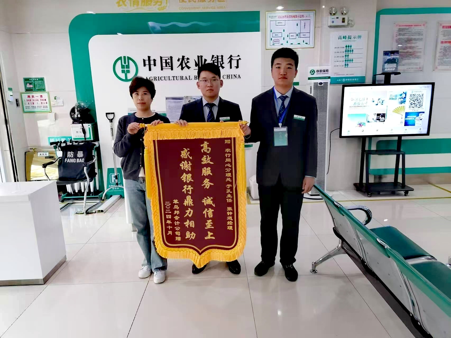 10月23日下午,农行禹城市支行下辖同心支行迎来一位特别的客户程女士。她步入大厅,手中紧握一面精心制作的锦旗,上面绣着“高效服务 诚信至上 感谢银行鼎力相助”两行大字,高兴地表达着对农行工作人员的感激之情。她说:“在最需要帮助的时候,是你们的无私付出为我解了燃眉之急,不仅挽回5万元损失,也让我的生意伙伴吃了定心丸,对你们这些敬业的员工再一次表示衷心的感谢。”