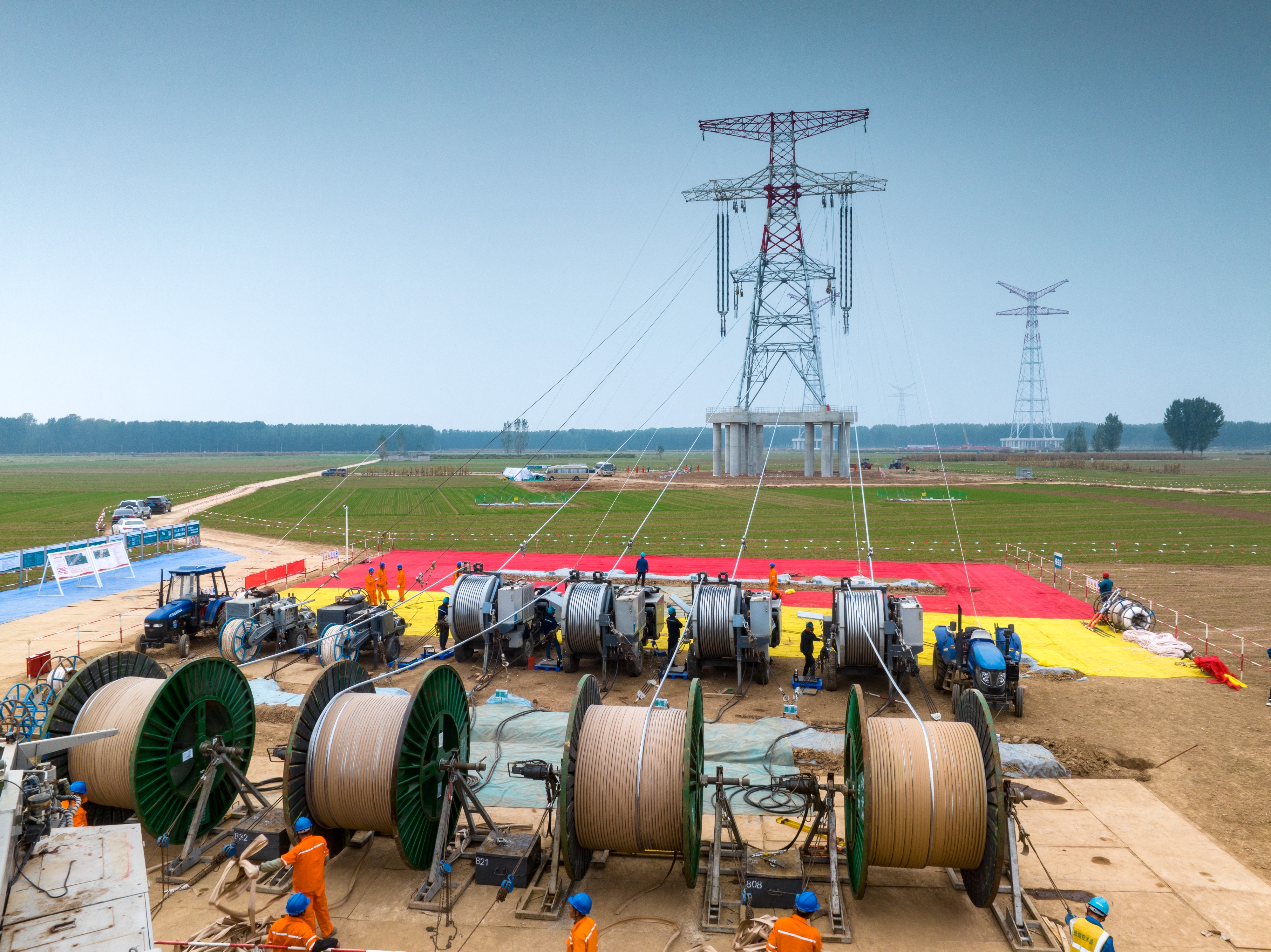 当天的黄河大跨越北岸位于聊城东阿,南岸位于济南平阴,两岸各有一基159.5米跨河高塔,为全线最高塔。大跨越耐张段长约2806米,工程采用“耐-直-直-耐”跨越方式,最大牵引力16.5吨,跨越距离长,放线张力大,技术难度高。
