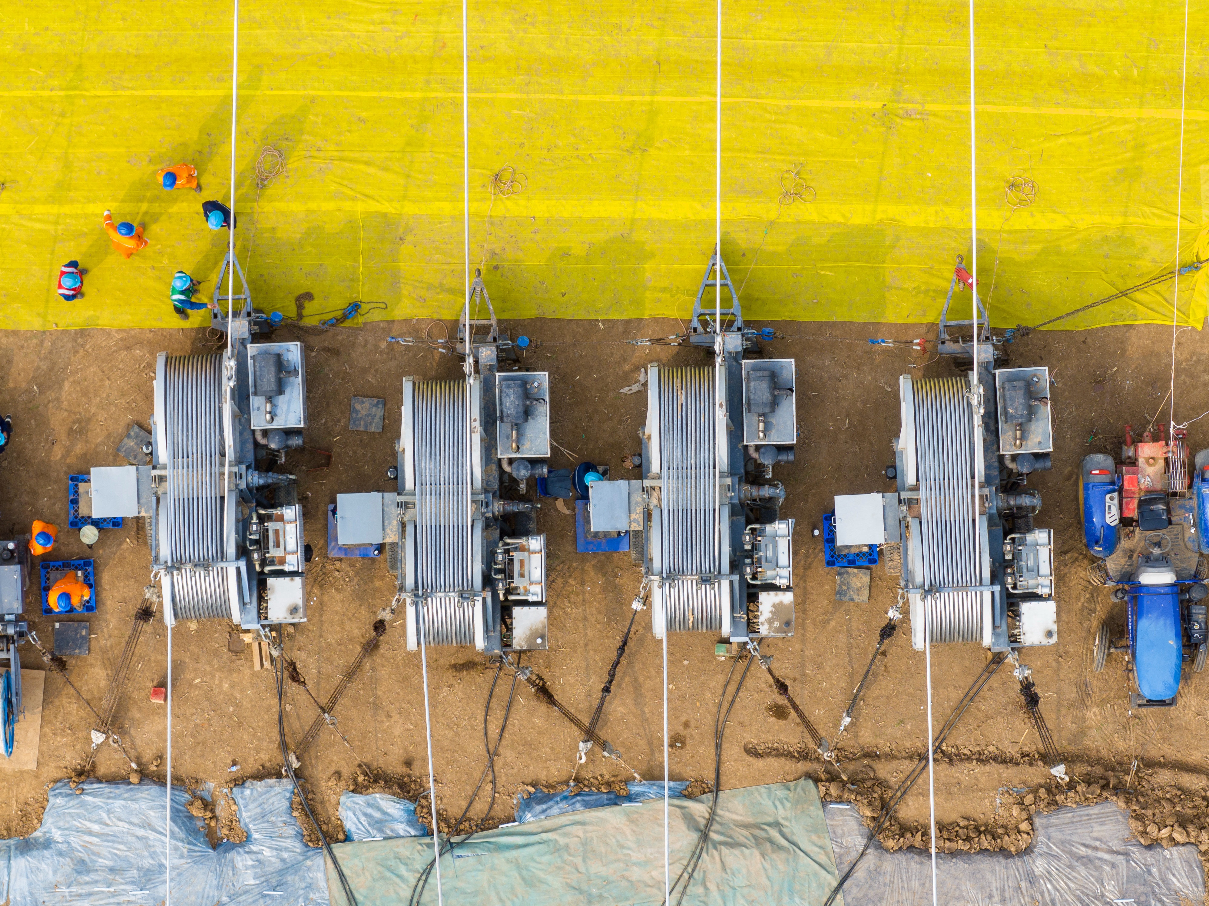 黄河大跨越工程采用了自主研发的集控智能牵张设备及放线架,实现同时操作多台设备,施工现场全过程监控机械化施工、智能化控制,大大降低了施工作业风险和人员作业劳动强度,推进重要节点施工保质提速。特制了大跨越工程专用导地线牵引管、铠装放线滑车、10吨级链条葫芦等工器具,从装备上保障黄河大跨越施工过程本质安全。工程创新采用了智慧张力放线系统,在牵张场地、跨越塔横担、走板等关键位置设置18组摄像头,跨河放线全过程实现集控化、可视化,提升机械化装备水平。