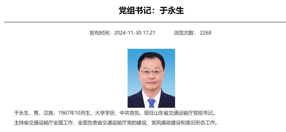 日前,山东省交通运输厅网站“领导信息”一栏更新显示,于永生已任山东省交通运输厅党组书记。