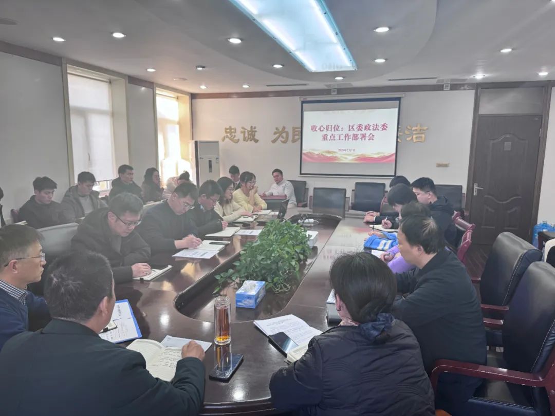 会议强调,要锚定全年目标任务和重点工作,统筹兼顾、协同发力,全力推动各项工作迅速干起来、热起来,奋力实现首季开门红、全年出重彩。要深入贯彻落实《中国共产党政法工作条例》,落实和完善党管政法工作制度,确保政法工作始终置于党的绝对领导之下。要以维护社会稳定责任制为抓手,深入推进“化解矛盾风险 维护社会稳定”专项治理,深化“一站式”矛盾纠纷调解中心建设,开展社会治安综合治理,确保社会稳定坚如磐石。要围绕区委区政府中心工作,优化法治化营商环境,提升公共法律服务水平,依法规范市场经济秩序,以高水平法治服务保障高质量发展。要加强政法队伍专业化建设,深化对党忠诚教育,增强担当本领,锤炼实干作风,努力锻造一支绝对忠诚、绝对纯洁、绝对可靠的政法铁军。