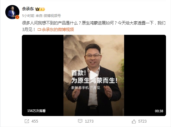 2月24日,余承东微博发文称“很多人问我想不到的产品是什么?原生鸿蒙进展如何?今天给大家透露一下,我们3月见!”他在视频中称,三月份要发布一款别人想不到的产品,这是一款原生鸿蒙新形态的手机,硬件、软件、生态全新突破。