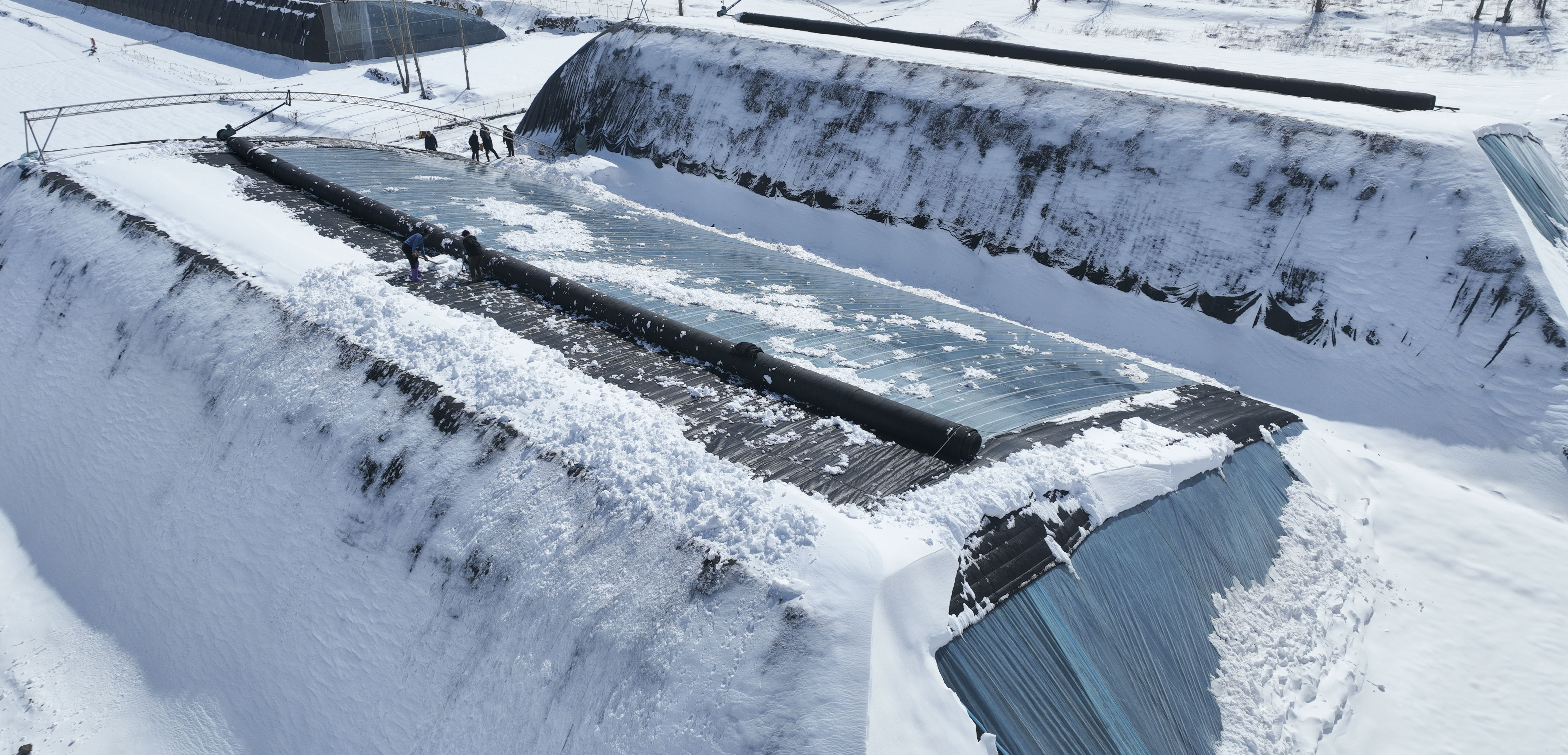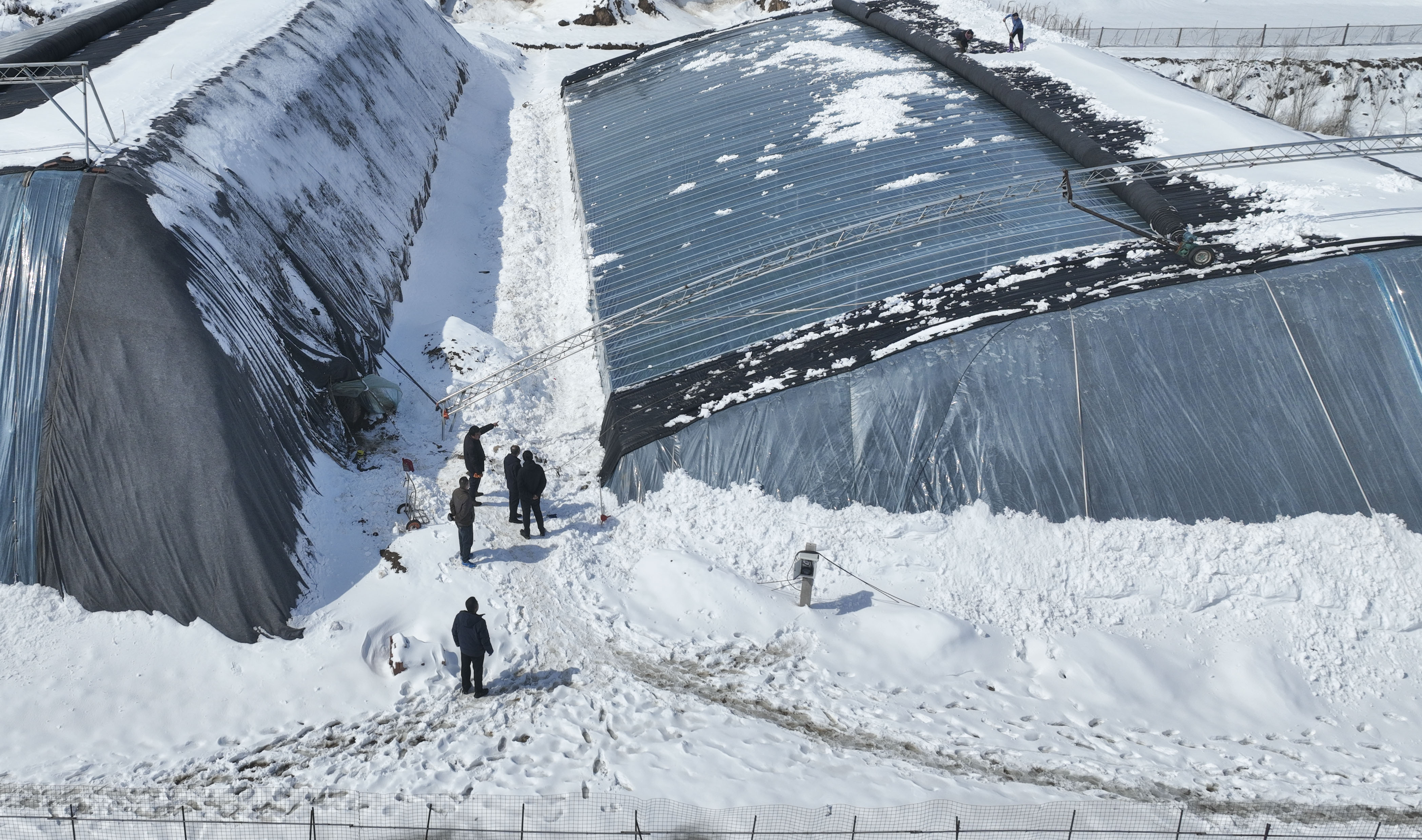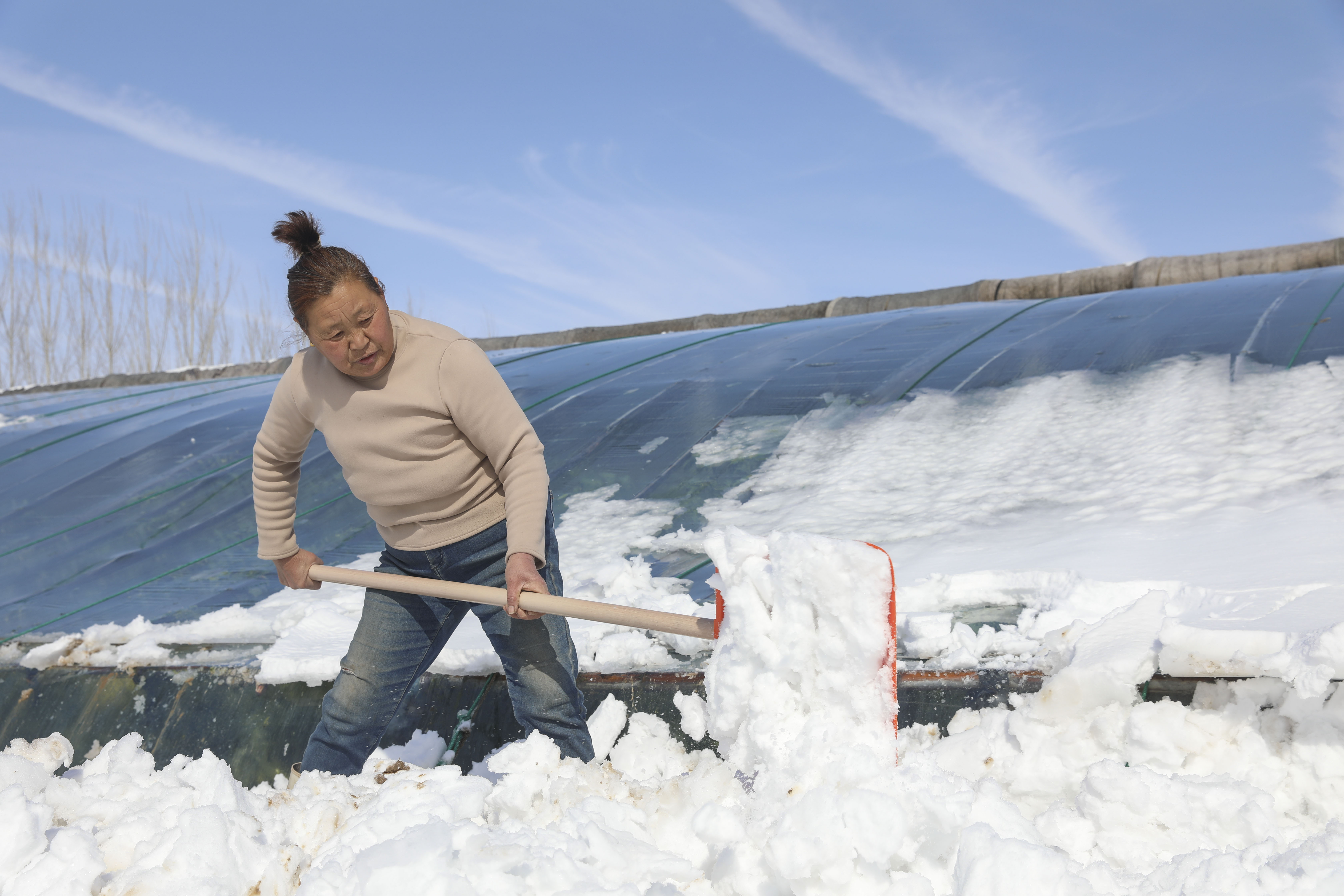 青阳镇化庄村菜农雪后清理大棚积雪。