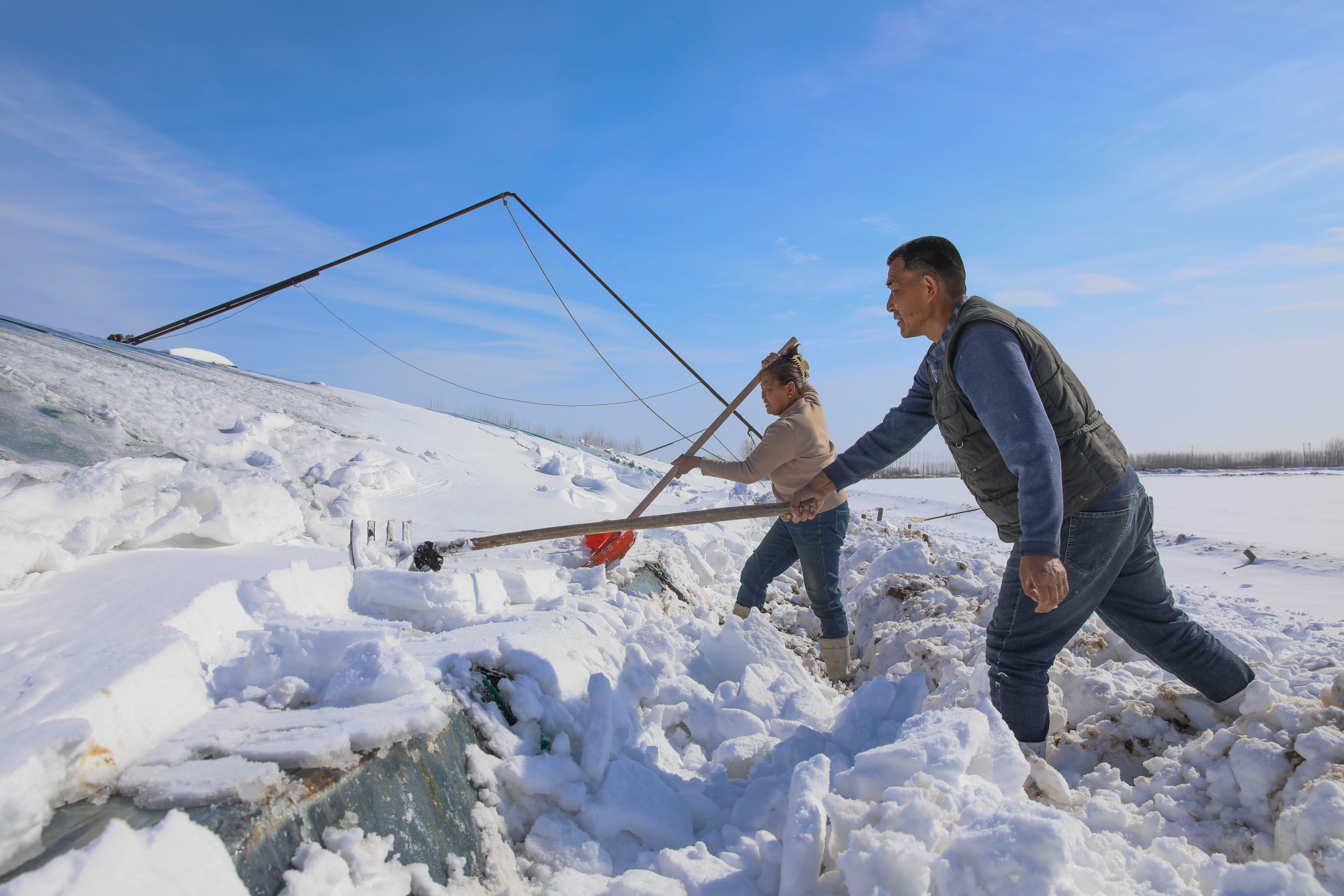 九户镇南北张村菜农在清理大棚积雪。