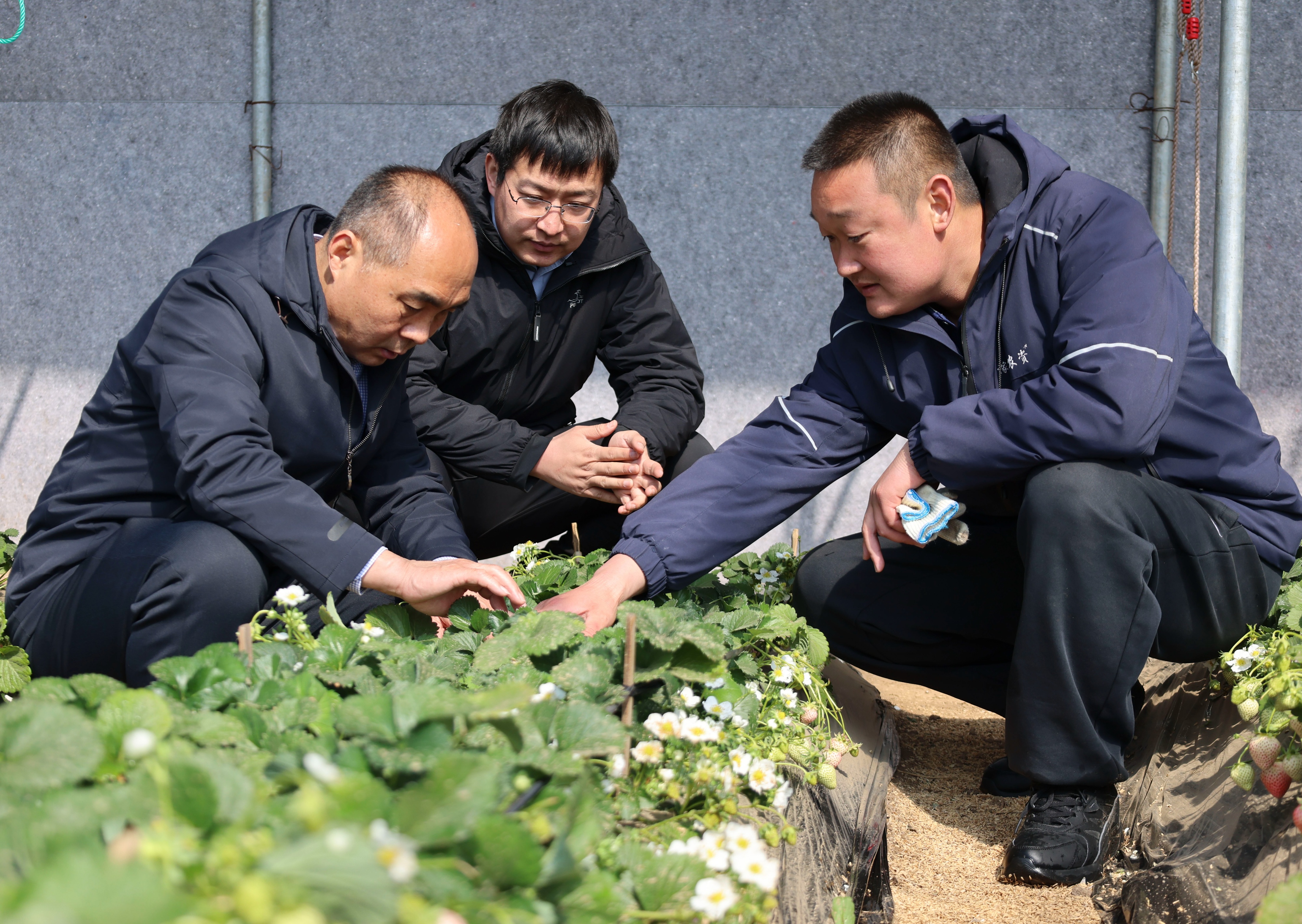 3月3日,邹平市青阳镇农业技术推广研究员孔令东(左一)在指导农户管理草莓。