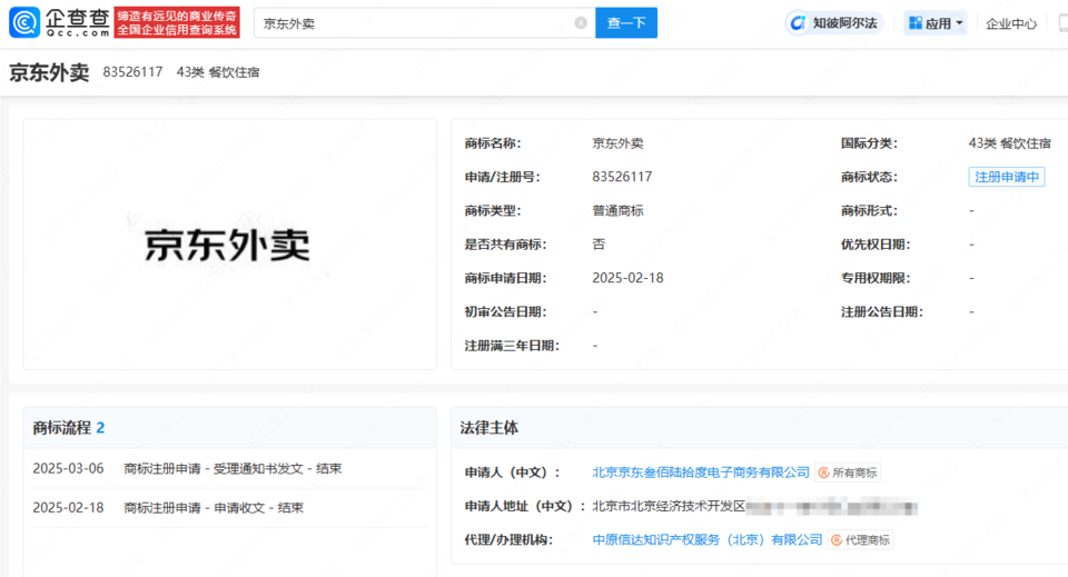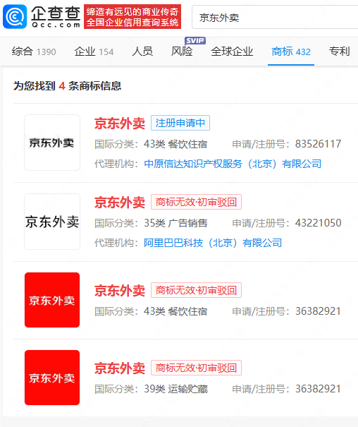 今年2月,京东宣布启动外卖业务。企查查APP显示,近日,北京京东叁佰陆拾度电子商务有限公司申请注册“京东外卖”商标,国际分类为餐饮住宿,当前商标状态为注册申请中。此前,曾有公司抢注京东外卖商标,目前已被驳回处无效状态。