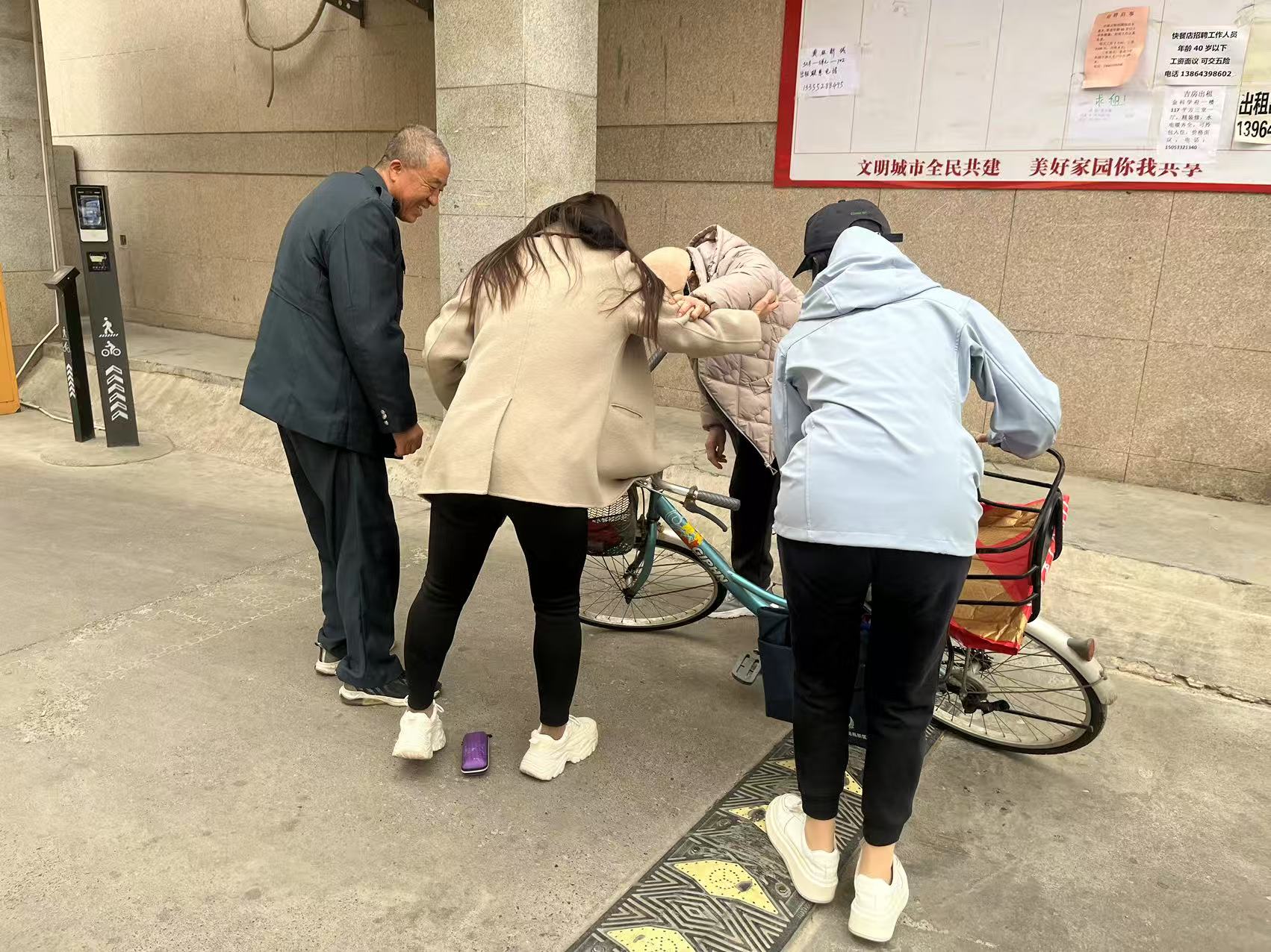 原来,一位老人骑自行车过减速带时不慎绊倒,巡查的社区工作人员黄环、丁雪、孙婵娟恰巧路过,立即上前搀扶,细心检查老人身体和车辆状况,确认无碍后叮嘱其注意骑行安全。
