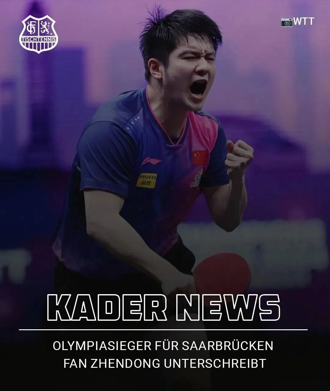 在俱乐部官方声明中,樊振东表示:我真的很期待在萨尔布吕肯和德甲的新挑战,体验新的环境——并与球队一起赢得更多的胜利。