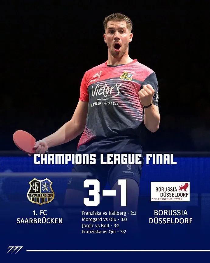 北京时间6月1日晚,欧洲乒联冠军联赛男团决赛,樊振东新赛季将加盟的萨尔布吕肯3-1战胜杜塞尔多夫,第三次夺得欧冠冠军。