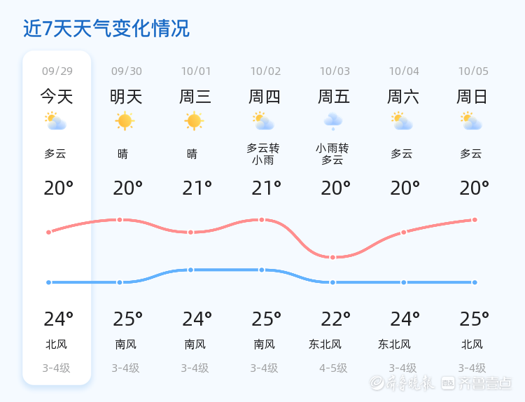 今天是9月29日,星期一,农历八月初八。青岛市今日天气以多云转晴为主,气温适中,最高气温24℃,最低气温20℃。目前温度为19.6℃,西北风2级,空气湿度较高,达99%,PM2.5指数为57,空气质量良好。