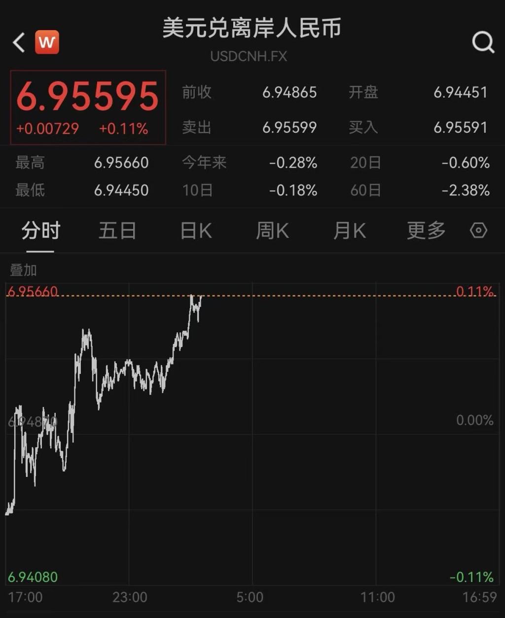 在离岸市场上,1月26日,更多反映国际投资者预期的离岸人民币对美元汇率1月26日盘中最高升至6.9445,创下2023年5月13日以来的新高,随后离岸人民币走弱并跌破6.95关口。