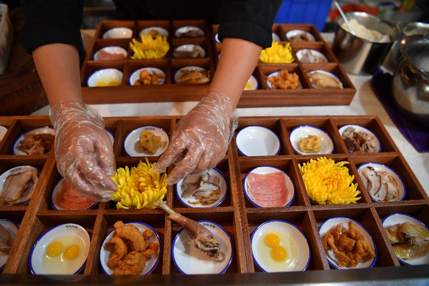 云南过桥米线店的工作人员正在装盘配菜。 中新社记者 刘冉阳 摄