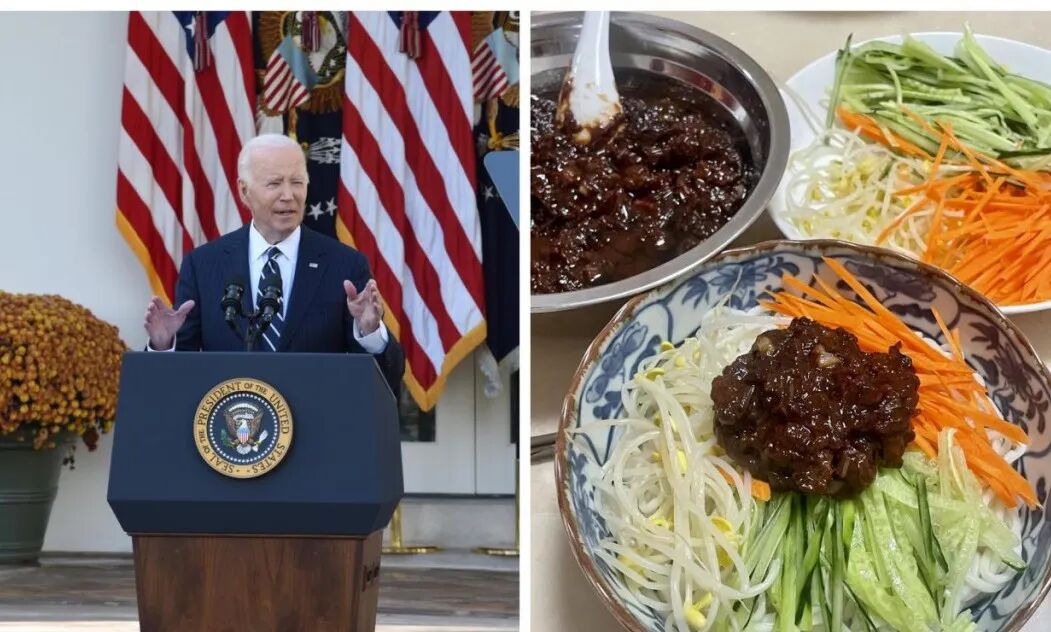 拜登与炸酱面。左图中新社记者 陈孟统 摄 右图图源网络