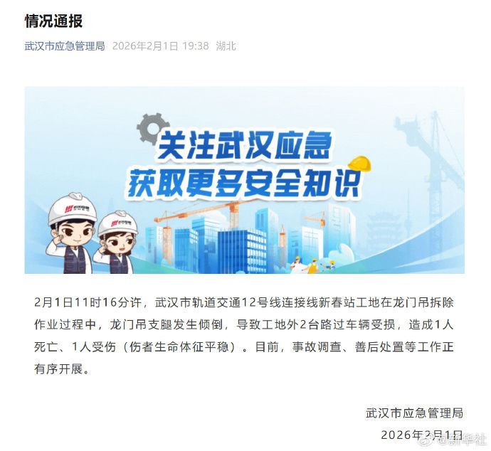 2月1日11时16分许,武汉市轨道交通12号线连接线新春站工地在龙门吊拆除作业过程中,龙门吊支腿发生倾倒,导致工地外2台路过车辆受损,造成1人死亡、1人受伤(伤者生命体征平稳)。目前,事故调查、善后处置等工作正有序开展。