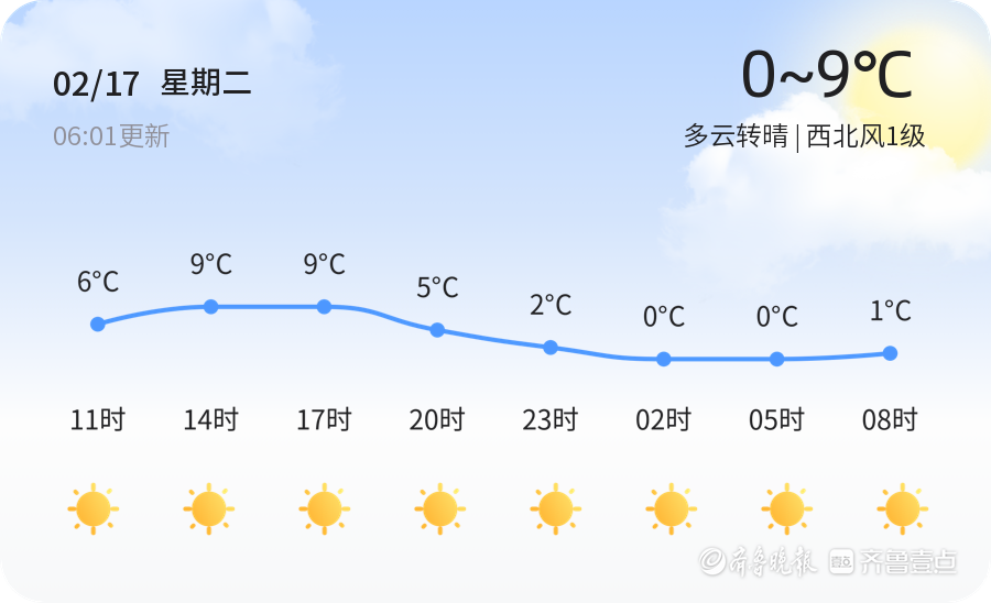今天是2月17日,星期二,农历正月初一。枣庄市今日天气为多云转晴,气温在0℃至9℃之间,西北风1级,空气湿度为75%。当前空气质量状况为重度污染,PM2.5指数为284。建议市民减少户外活动,特别是敏感人群,外出时佩戴口罩,做好防护措施。由于今日气温较低,市民出行时请注意保暖,随身携带雨具以备不时之需。
