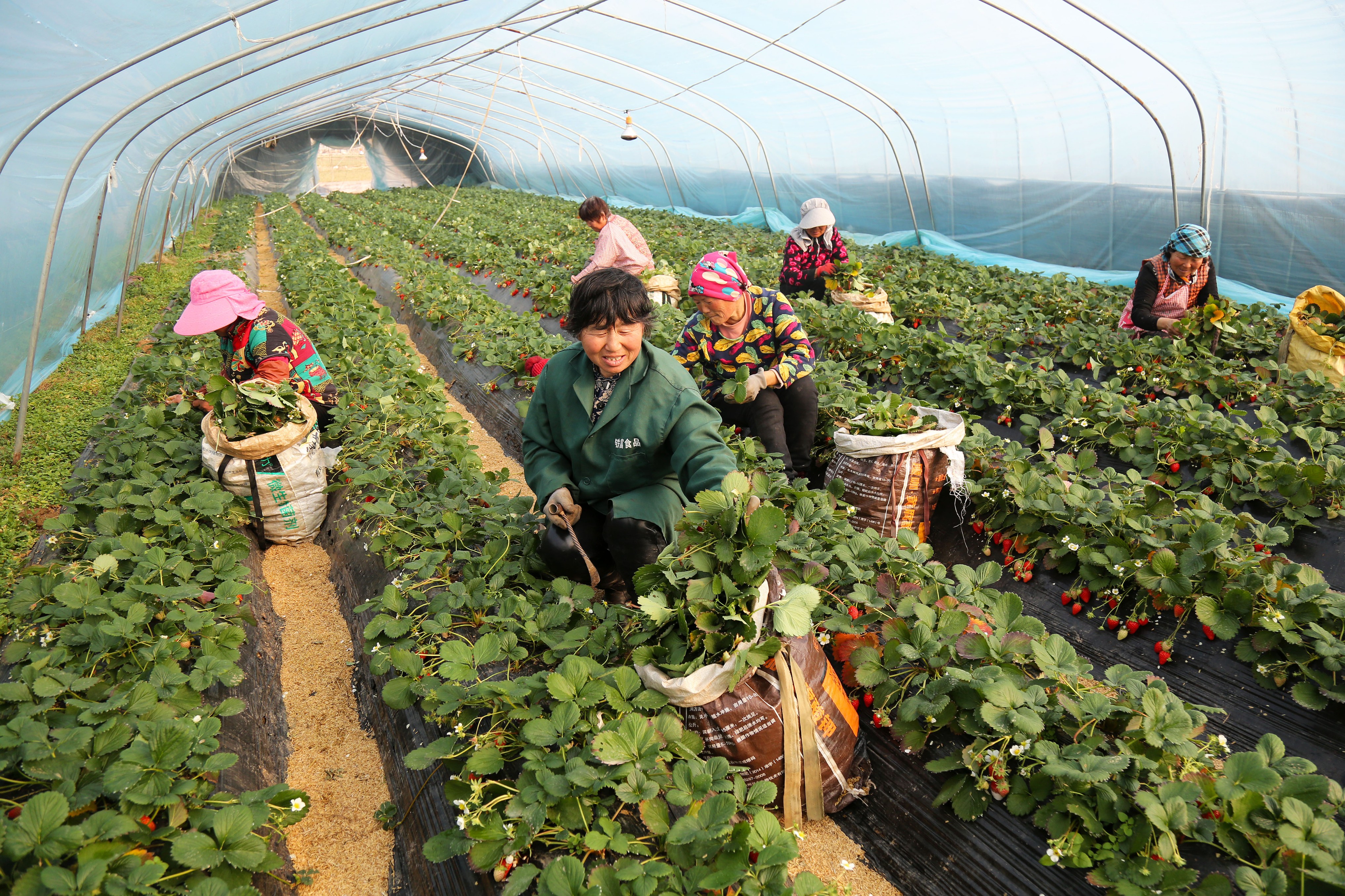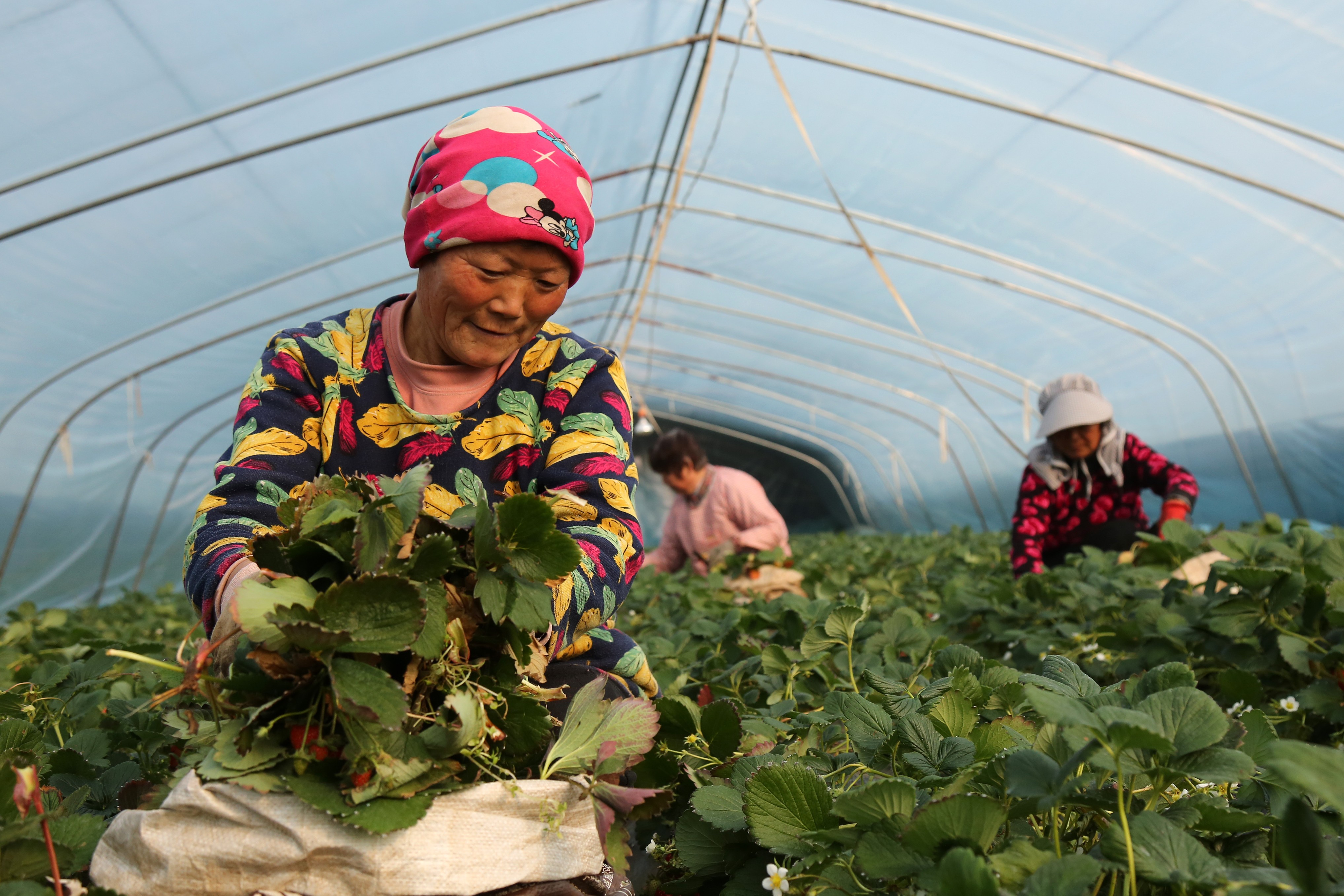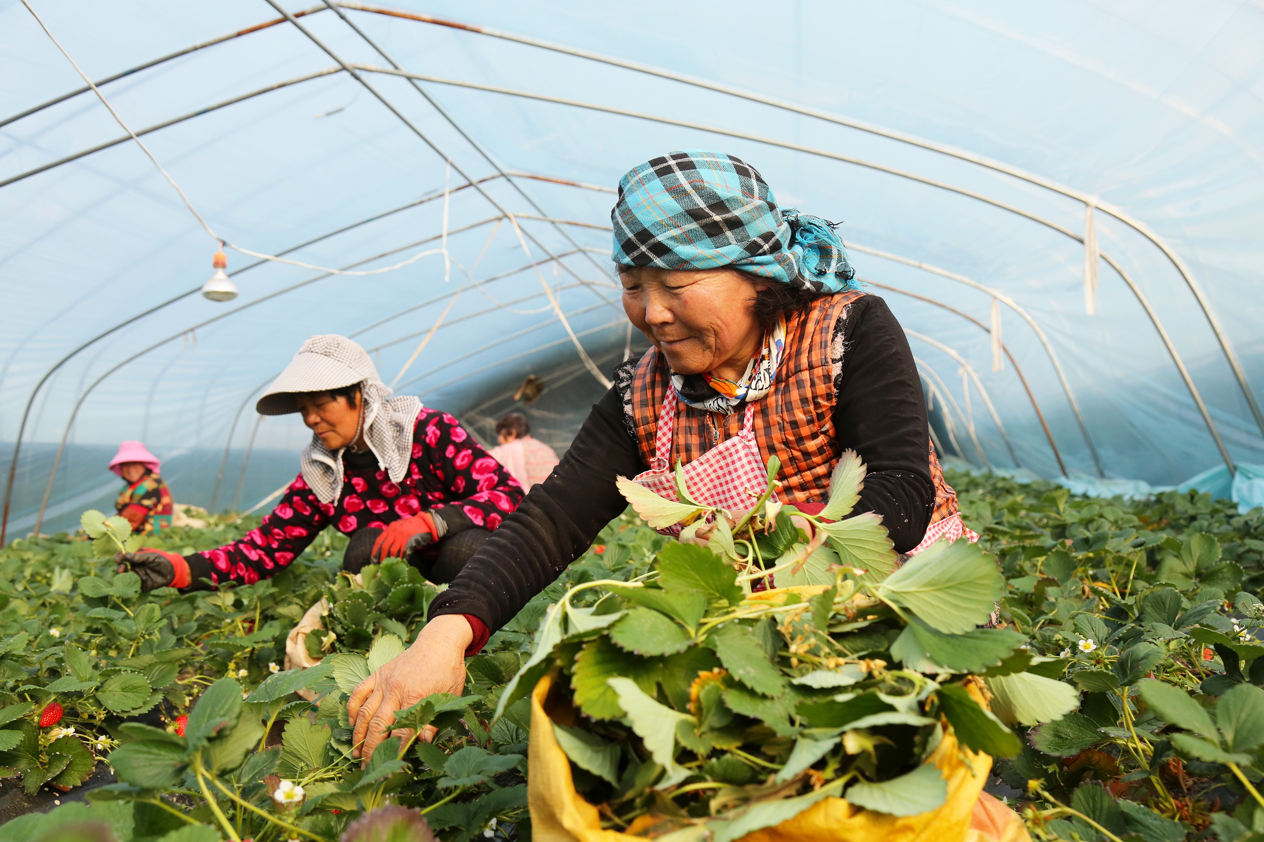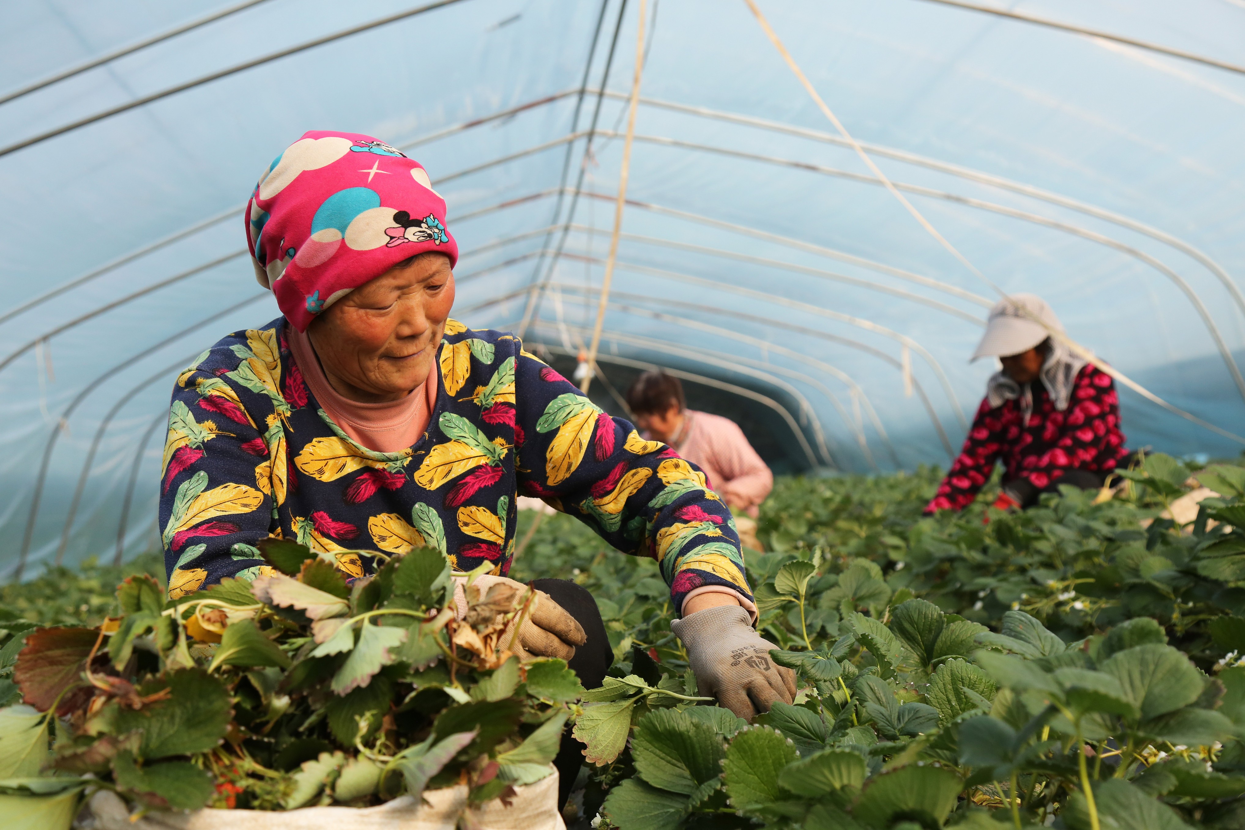 寒冬时节,山东省枣庄市市中区峨山口村的大棚内,种植户们正忙着管护草莓,以提高出果率,保障春节前市场供应。