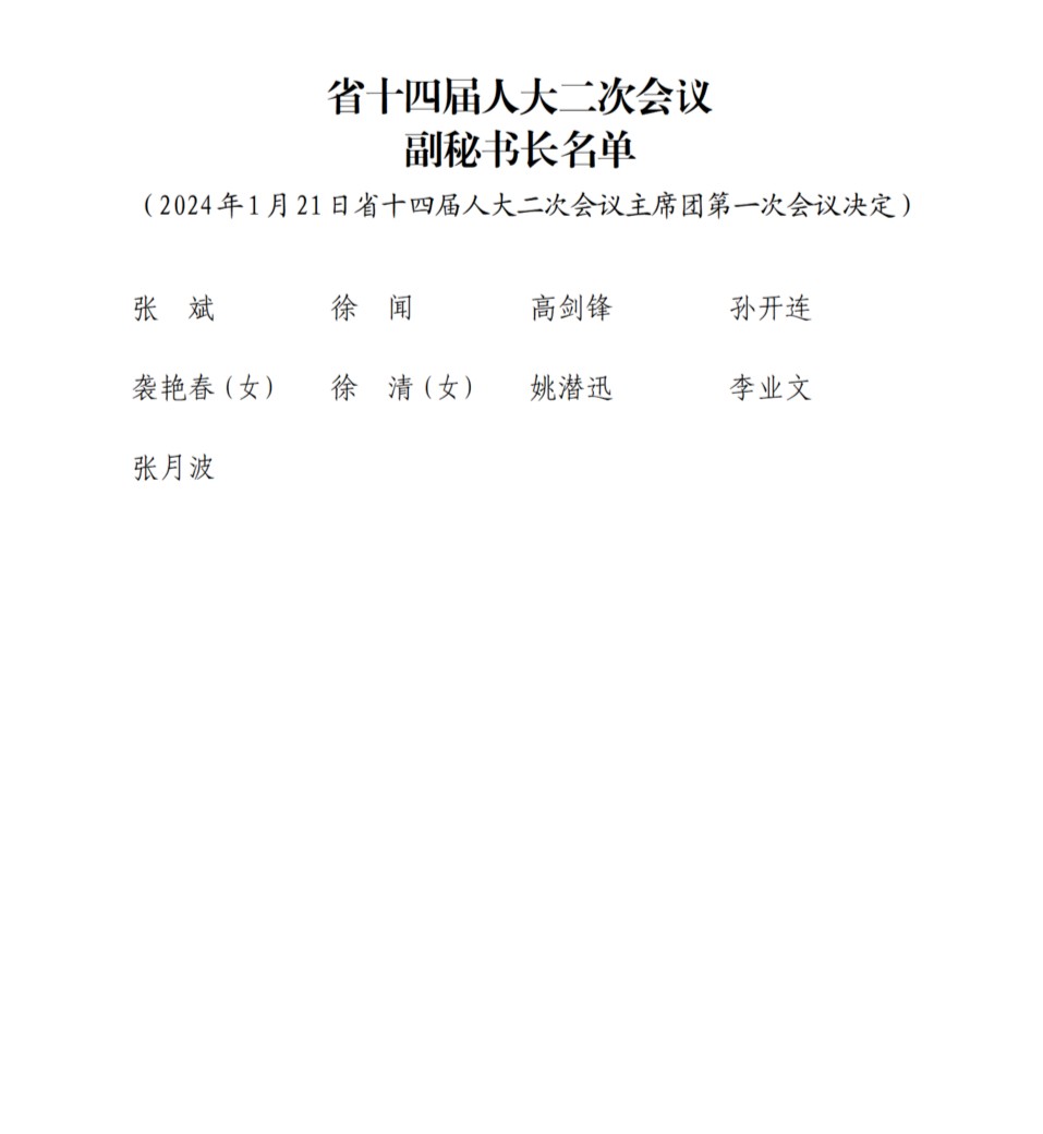 省十四届人大二次会议副秘书长名单来源:大众新闻客户端2024-01-21 20:36:31原创责任编辑:张誉耀大众新闻原创内容,未经授权不得转载转载事宜请联系大众新媒体大平台 联系电话:0531-85193469
