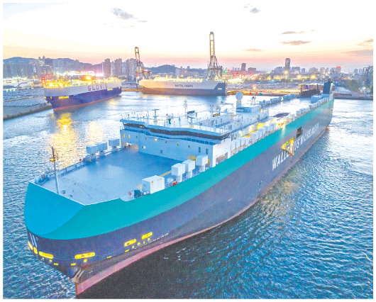 全球最长汽车运输船“泰斯堡”轮在山东港口烟台港完成985台出口汽车装船作业