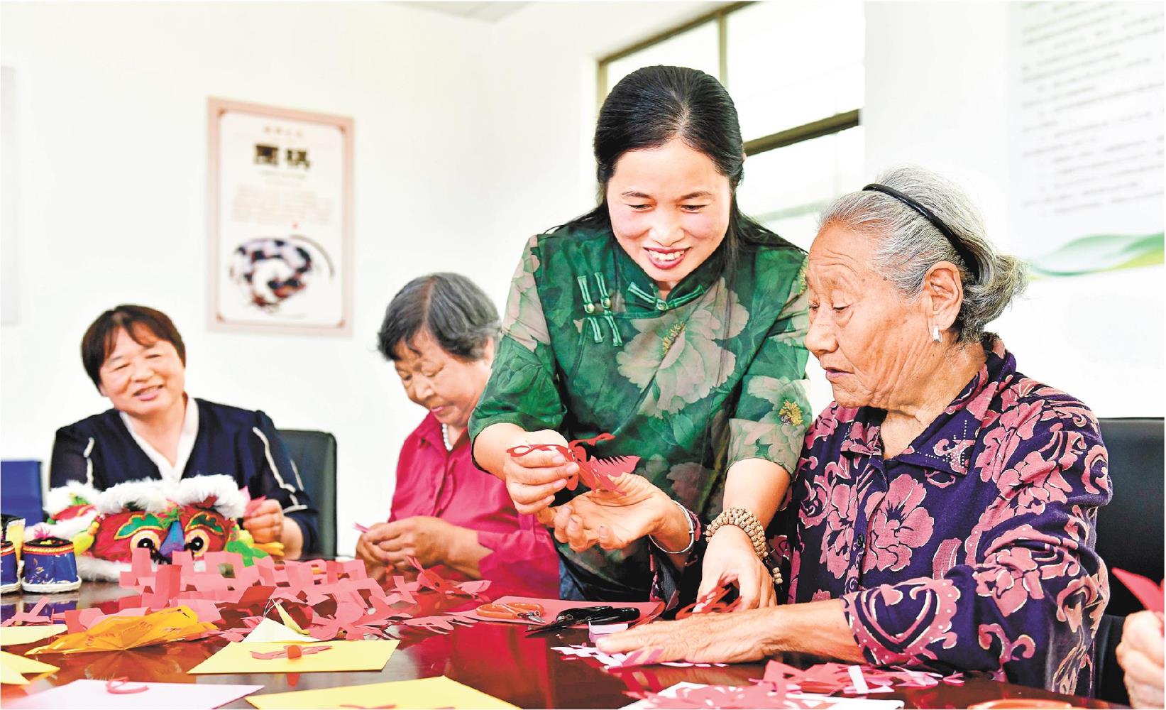 □ 新华社发 在郓城县郓州街道王沙湾社区日间照料中心,老人学习剪纸。