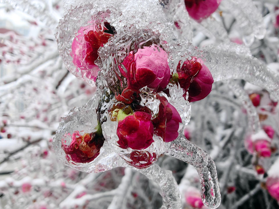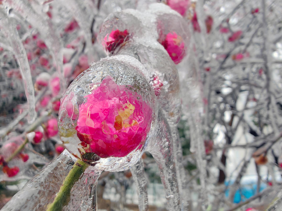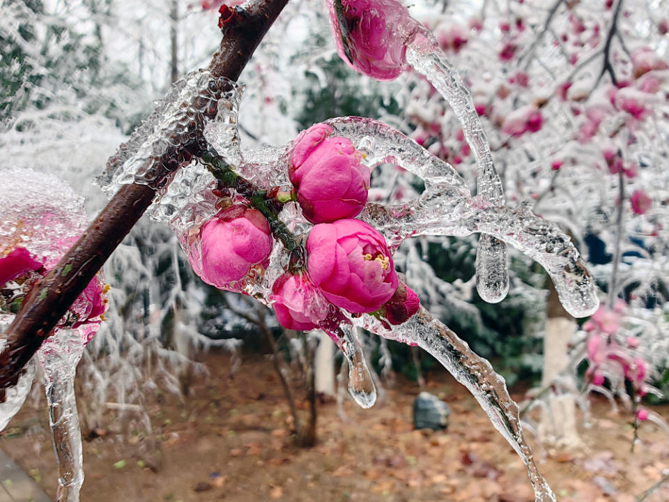 长沙梅溪湖篮球公园出现罕见的“冰冻梅花”,大面积梅花的花苞和花瓣被雪和冰凌包裹,晶莹剔透,像一块块水晶,美不胜收。(图文/沅水·昊境)