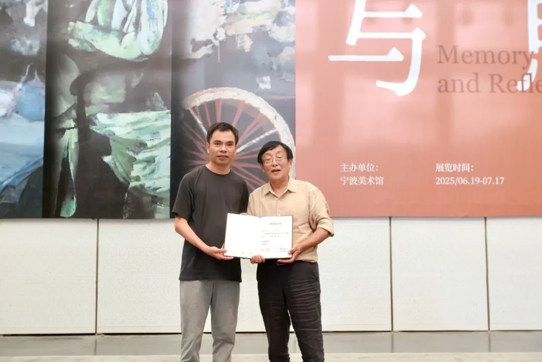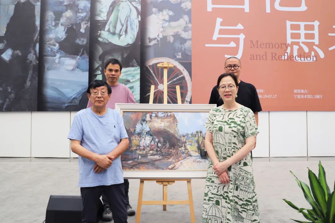 俞晓夫向宁波美术馆捐赠作品《大连造船厂》,宁波美术馆学术典藏部主任黄易锋接受捐赠并颁发收藏证书