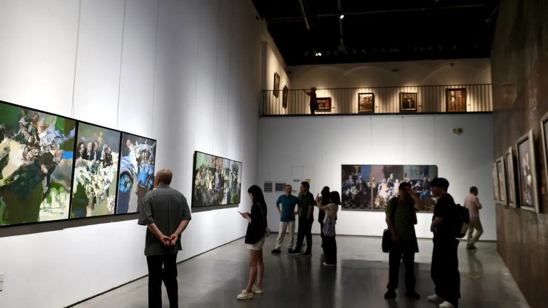 本次展览展出了俞晓夫的多幅经典作品,例如《我和吴昌硕游汉堡》以诙谐的笔触让历史人物跨越时空的界限;而《哲学家——纪念萨特和加缪》则巧妙地结合了超现实主义元素,在存在主义的群像中融入了自画像,体现了其深邃的人文关怀。宁波美术馆收藏的近作《小聚·我的玩偶之家》,则是他个人艺术语言的典型体现,以其深邃的思考、精湛的技艺和独特的视觉呈现,激发观众对现实、历史与人性的多维度解读。