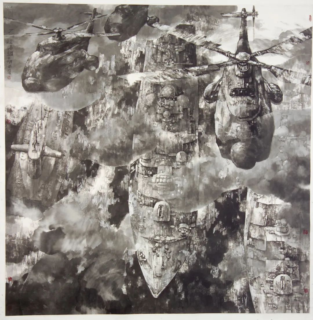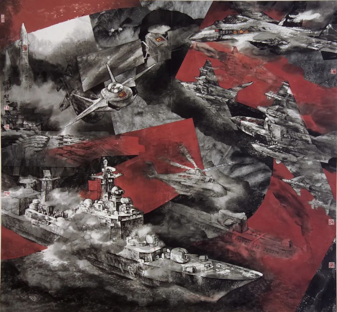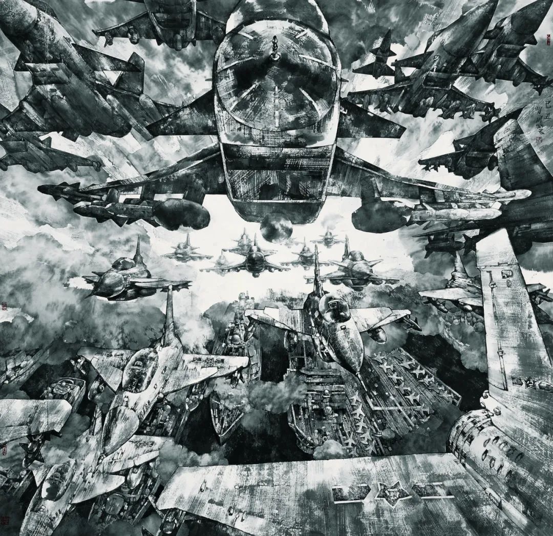 在《港的律动》作品中,他让五代董源的披麻皴在军港和航母甲板上复活,使宋代米氏云山在战机尾流中重组;在《世纪构建》中,航天器升空和战斗机阵列与传统山水中的“点苔法”产生基因共振。这种创作不是简单的技术拼贴,而是通过“跨时空基因编辑”,使水墨获得表现数字时代视觉经验的新能力。张明川的突破在于发现了军事题材的特殊性——现代战争装备作为人类技术的极端形态,恰好成为测试传统笔墨当代转化率的绝佳试剂。