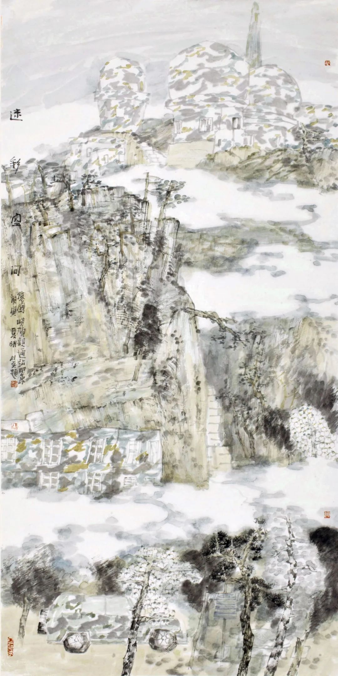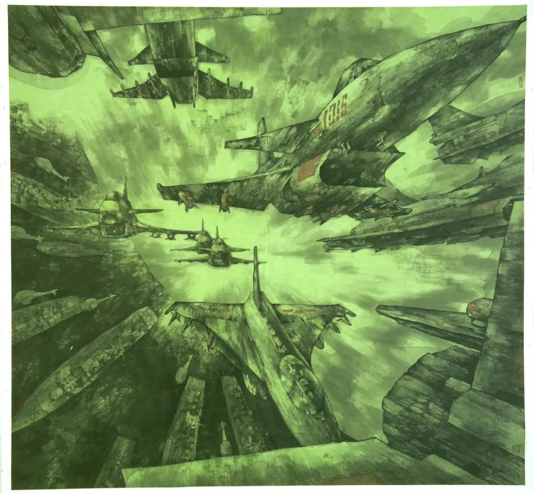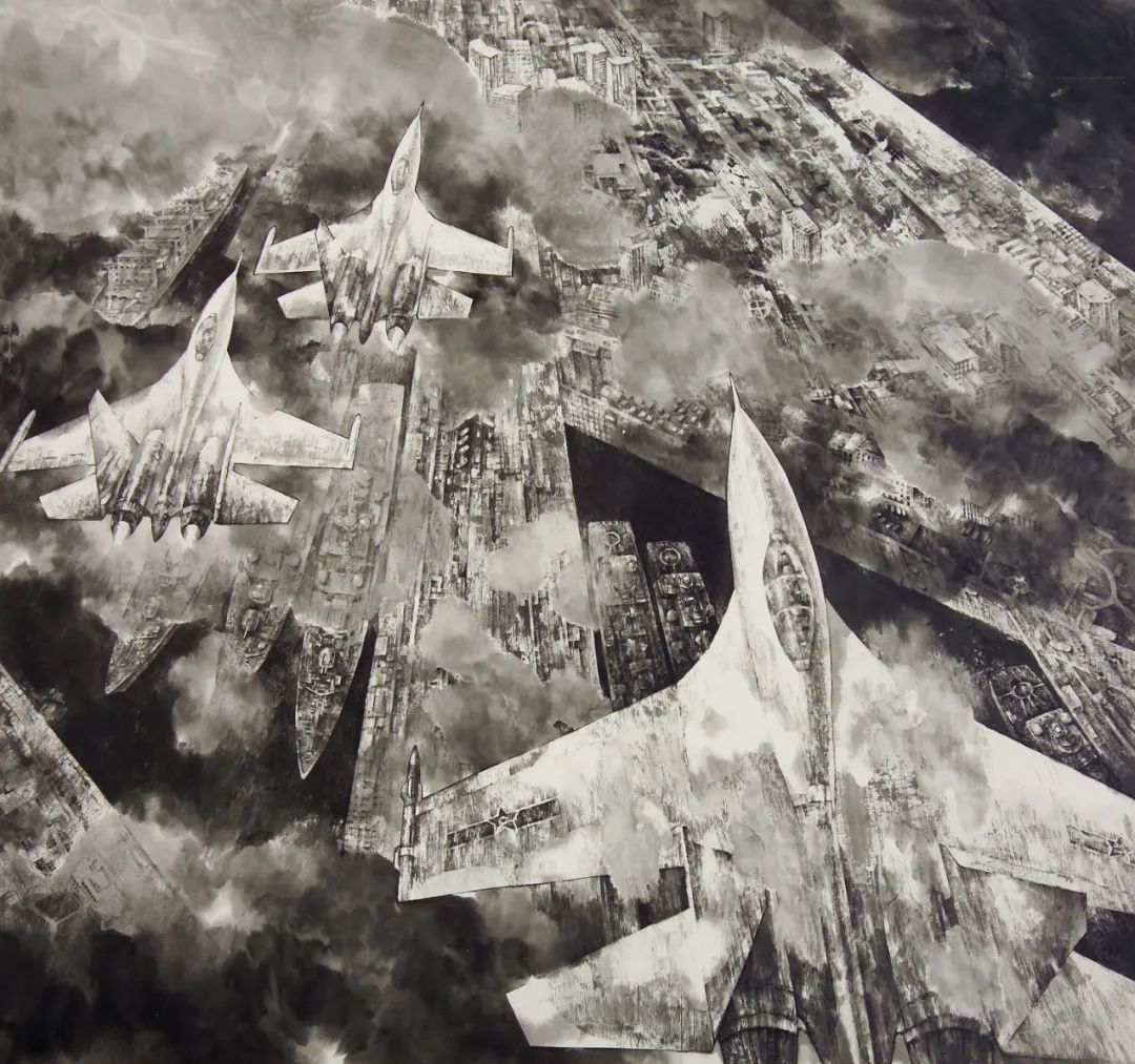 在《港的律动》作品中,他让五代董源的披麻皴在军港和航母甲板上复活,使宋代米氏云山在战机尾流中重组;在《世纪构建》中,航天器升空和战斗机阵列与传统山水中的“点苔法”产生基因共振。这种创作不是简单的技术拼贴,而是通过“跨时空基因编辑”,使水墨获得表现数字时代视觉经验的新能力。张明川的突破在于发现了军事题材的特殊性——现代战争装备作为人类技术的极端形态,恰好成为测试传统笔墨当代转化率的绝佳试剂。