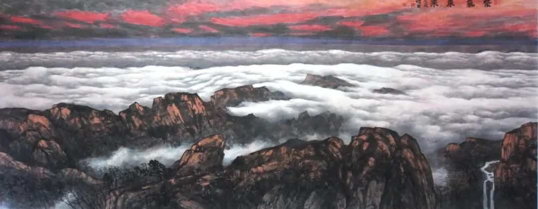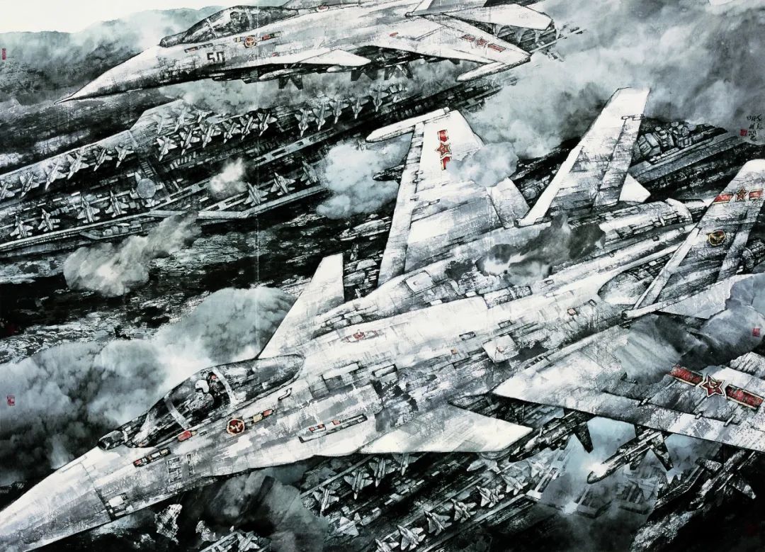 在当代中国美术的星空中,张明川的艺术实践宛如一颗轨迹奇特的彗星——他以水墨为介质,将钢铁战舰的冰冷轮廓、战机引擎的灼热气流与传统山水的空灵意境熔铸一体,创造出一种前所未有的美学范式。这种被学界称为“军事山水画”的探索,不仅是对题材疆域的突破,更是一场关于文化基因重组的美学实验。当航空母舰的钢铁脊梁在宣纸上投下水墨的暗影,当歼击机的流线型机翼切割传统云气的留白,我们目睹的不仅是一位军旅画家的个人突破,更是一个古老文明在当代语境下的视觉转译与精神重构。