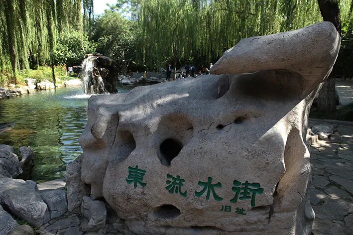 1980年代中期开始,五龙潭开始打造公园,并进行了几次扩建。东流水除105号的小楼就地保护外,其余建筑大多拆除,这条老街也从此消失。原来立在月牙泉边的“东流水街旧址”石刻,权作是对怀旧之人的一丝安慰。如今,这块太湖石刻被移到公园最南端的绿篱中,不是特意寻觅便很难发现。