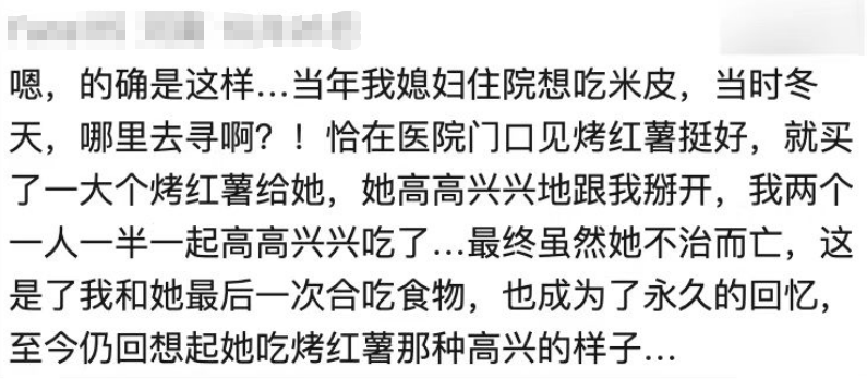 图源:小红书@成事文家家但为什么是烤红薯而不是冰淇淋?毕竟夏天的医院门口也有烤红薯摊的影子。原因就在那股热乎气儿上。医院的白墙、消毒水味不管任何时候总有着让人紧绷的凉意。陪诊的家属步履匆匆急着赶流程,输液的患者手臂里、血管里都是寒意,担心、焦虑、害怕,极度收紧的情绪太需要放松。