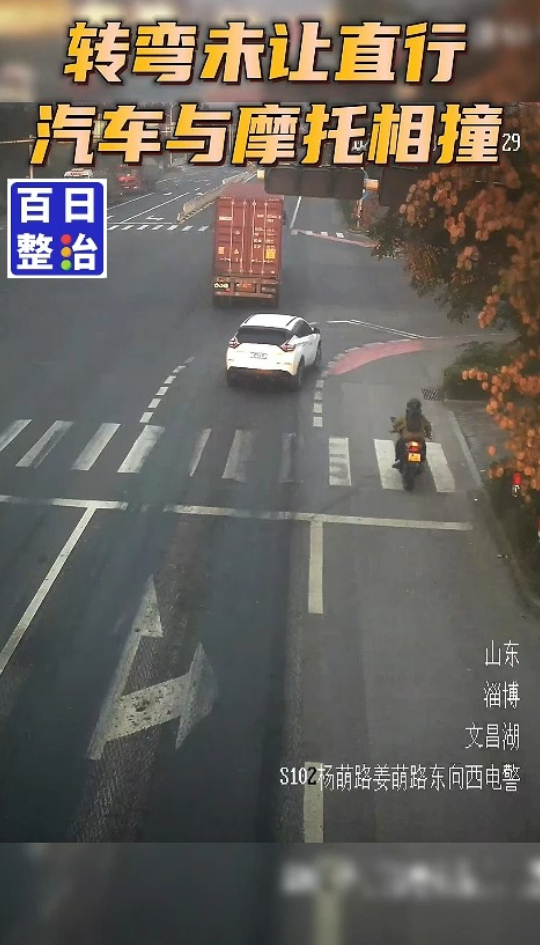转弯未让直行 汽车与摩托车相撞 @淄博交警