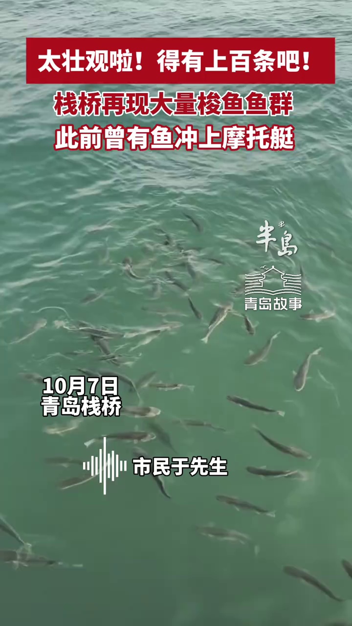 太壮观啦!得有上百条吧!栈桥再现大量梭鱼鱼群,此前曾有鱼冲上摩托艇(半岛全媒体首席记者 孙桂东 编辑 杨姗姗)