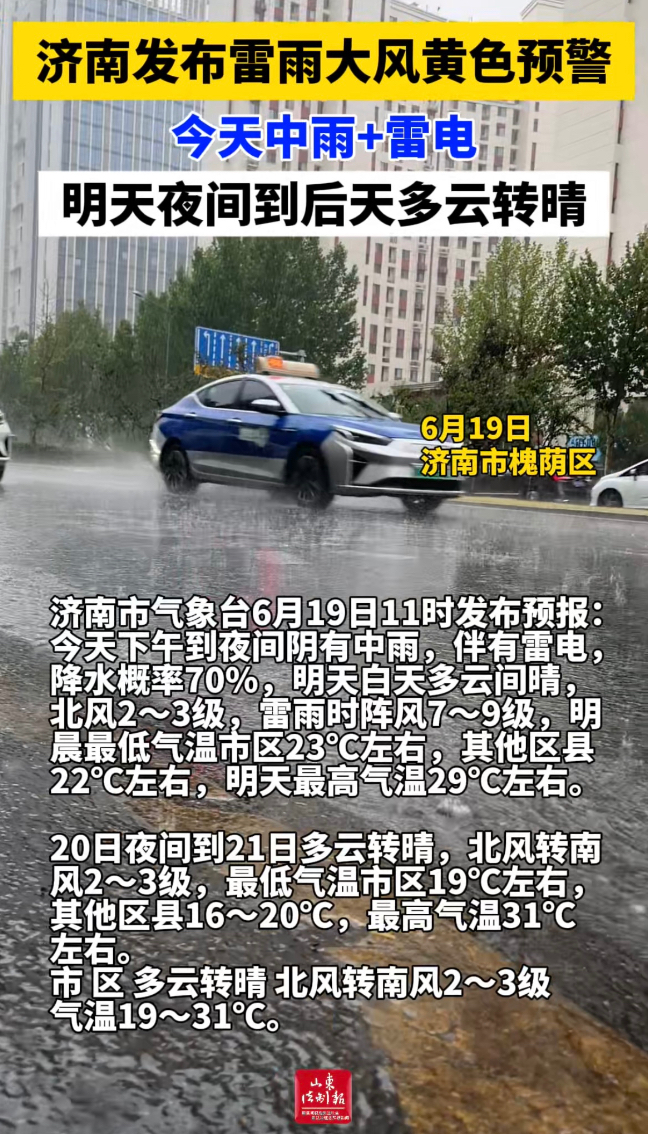 济南发布雷电大风黄色预警 今天中雨+雷电,明天夜间到后天多云转晴