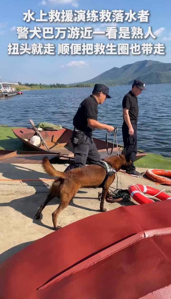 水上救援演练,警犬巴万全力以赴奔赴“落水者”,发现是熟人,掉头就走,还带走游泳圈……